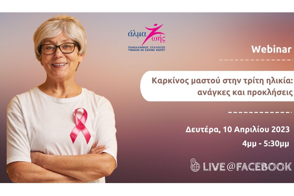 Ο Πανελλήνιος Σύλλογος Γυναικών με Καρκίνο Μαστού “Άλμα Ζωής” διοργανώνει τη Δευτέρα στις 10 Απριλίου 2023, 4μμ – 5:30μμ, το διαδικτυακό σεμινάριο (webinar) με θέμα: «Καρκίνος μαστού στην τρίτη ηλικία: ανάγκες και προκλήσεις». Το webinar θα μεταδοθεί ζωντανά, μέσα από τη σελίδα του συλλόγου στο Facebook.