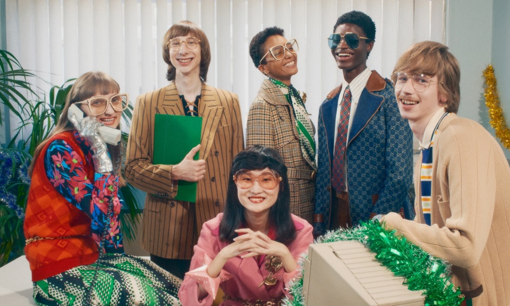 Στην “Gucci Gift Giving” καμπάνια, φωτογραφημένη από τον Mark Peckmezian και σκηνοθετημένη από τον Akinola Davies Jr, οι πρωταγωνιστές εργαζόμενοι μετατρέπονται με το πέρας της εργασίας τους σε clubbers, οι οποίοι έχουν οργανώσει ένα μοναδικό Secret Santa πάρτυ!