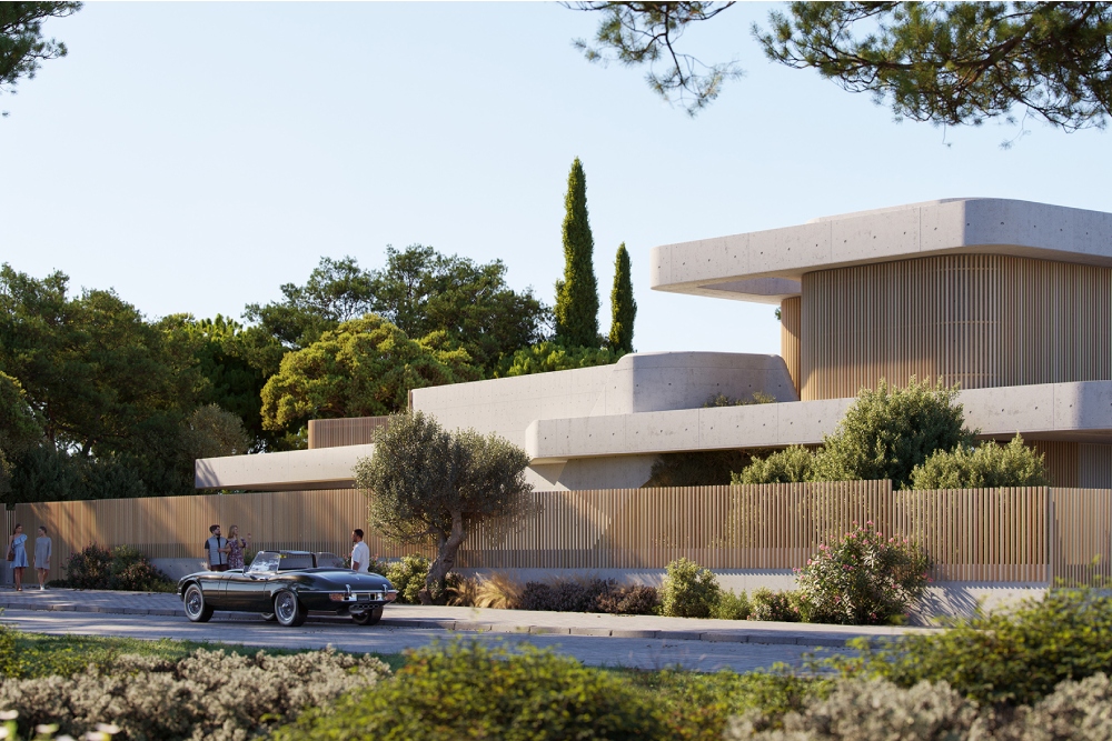 Η αρχιτεκτονική χειρονομία μιας μακράς ρέουσας μορφής σε σχήμα «L» κατά μήκος των.δύο κύριων άκρων του οικοπέδου επιδιώκει να δημιουργήσει ένα φίλτρο μεταξύ του περιβάλλοντος τοπίου και του αρνητικού του που προκύπτει,.μια αυλή παρόμοιας κλίμακας με το αποτύπωμα του κτιρίου. Αυτή η ρευστή μορφή «στενεύει» και «διευρύνεται» για να δημιουργήσει «ένταση».με την κλειστή αυλή, αλλά είναι άκαμπτη κατά μήκος της περιμέτρου του χώρου, σχηματίζοντας μια καλά ορισμένη άκρη. Οι καμπύλες άκρες της κτιριακής μάζας απαλύνουν την άκαμπτη εμφάνιση προς τον περίγυρο, περιμένοντας μια «αλλαγή», όπου ο όγκος της κατοικίας,.η εσωτερική αυλή και το εξωτερικό.σκηνικό θα συνδέονται σε μια ισορροπημένη συνέργεια, ενωμένα με το φυσικό φως, προσδιορίζοντας το αναγνωρίσιμο όριο και την τεταμένη και συνεχή σχέση.του μεταξύ του κτιρίου και του εσωτερικού διαμορφωμένου χώρου.