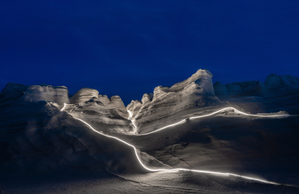 Η ελαστική φύση του KEISO αποδείχθηκε ιδανική για το συγκεκριμένο εγχείρημα. Ο φωτιστικός σωλήνας ακολουθεί κάθε καμπύλη και ανάγλυφη επιφάνεια των βράχων. Ελίσσεται ανάμεσά τους και γίνεται ένα με αυτούς. Το αποτέλεσμα είναι η σύνθεση μιας φυσικής φωτιστικής ροής, σχεδόν εξωπραγματικής, όπως και το σεληνιακό τοπίο. Απόλυτη, αρμονική και αγνή ομορφιά, χωρίς την ύπαρξη οπτικών εμποδίων από τις πηγές φωτισμού.