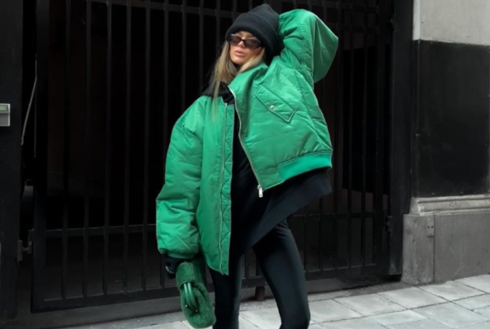 Η Hanna Schönberg επέλεξε μία απόλυτα χειμερινή εμφάνιση, με stand out item ένα overised πράσινο bomber και ένα πράσινο hand bag.