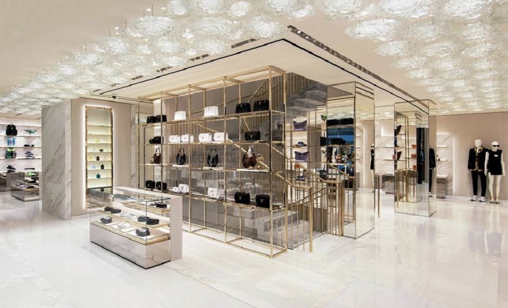 Πρόκειται για ένα πραγματικό αρχιτεκτονικό στολίδι. Κομψοί τοίχοι με ουδέτερα χρώματα, λευκά και γκρι μαρμάρινα δάπεδα, χρυσές, μεταλλικές κατασκευές και πολυέλαιοι σε στυλ μπαρόκ, συνθέτουν ένα μαγικό αποτέλεσμα. Τόσο το σχέδιο, όσο και η ιστορική, πλέον, τοποθεσία δημιούργησαν ένα κατάστημα που πρεσβεύει τον οίκο και είναι κατάλληλο για την ανάδειξη των ρούχων του.