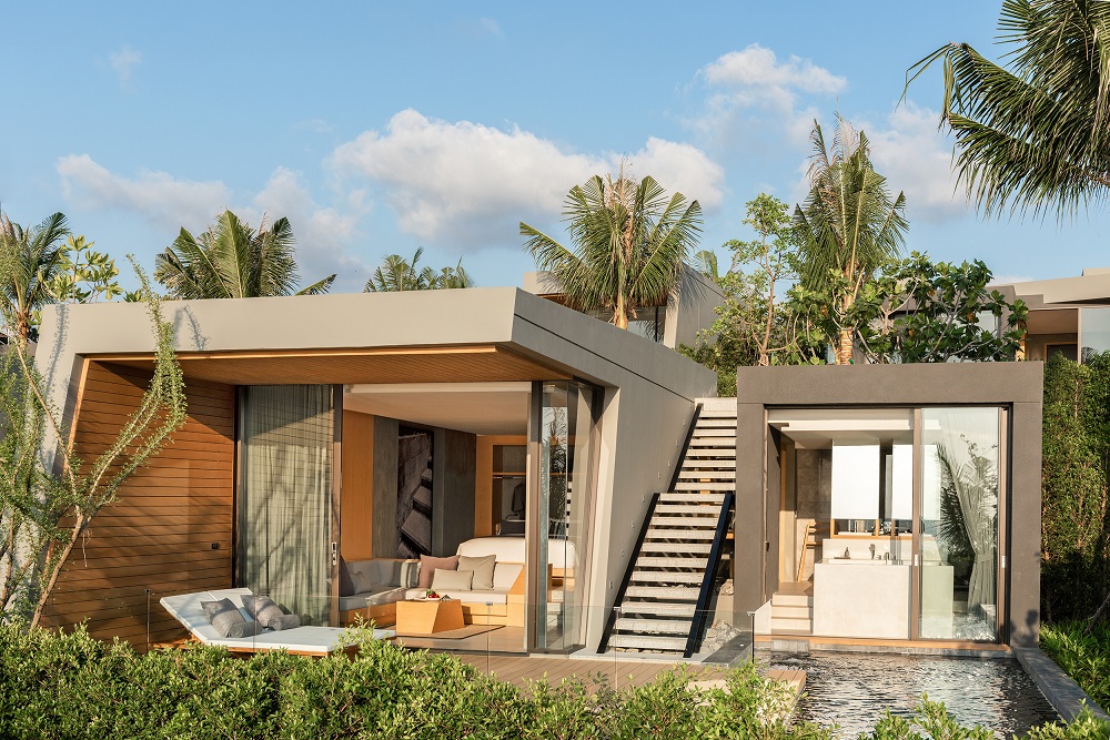 To πολυτελές ξενοδοχείο ισορροπεί ανάμεσα στο bohemian και μοντέρνο ύφος, ακολουθώντας μια ήσυχη, γήινη παλέτα, με ενδιάμεσες παστέλ “εκρήξεις”. Patterns ψαροκόκαλου, φυσικά υλικά, χειροποίητα υφαντά, πλεκτά φωτιστικά, rattan έπιπλα και αιώρες από το Yukatan αντικρίζουν τη μοναδική θέα, μέσα από τα μεγάλα ανοίγματα των δωματίων.