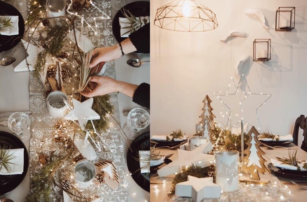 Τα υλικά που έχει το τραπέζι είναι φυσικά κλαδιά από έλατο και καρπούς, ξύλινα αστέρια και δέντρα, μικρά air plants σε κάθε πετσέτα για να δωρίσετε στους καλεσμένους σας, κεριά και μικρά λαμπάκια για τις απαραίτητες λάμψεις!