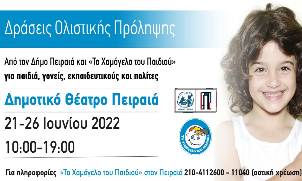 Αναγνωρίζοντας τον καθοριστικό ρόλο της πρόληψης σε κρίσιμους τομείς, που αφορούν στη ζωή και τα δικαιώματα των παιδιών, ο Δήμος Πειραιά και “Το Χαμόγελο του Παιδιού” συνδιοργανώνουν και υλοποιούν δωρεάν Δράσεις Ολιστικής Πρόληψης από 21 έως 26 Ιουνίου 2022 και ώρες 10:00 έως 19:00, στον Προαύλιο χώρο του Δημοτικού Θεάτρου Πειραιά.