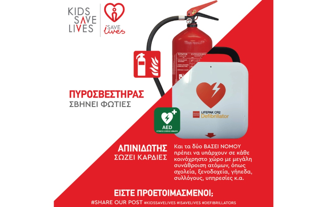 Είναι πολύ σημαντικό να αναγνωρίσουμε πως η τοποθέτηση πυροσβεστήρων και απινιδωτών σε κάθε χώρο που περιγράφει ο νόμος, είναι το ίδιο κρίσιμος και σημαντικός. Και τα δύο σώζουν ζωές, αν χρησιμοποιηθούν σωστά τα πρώτα λεπτά της κρίσης. Ωστόσο, το ένα από τα δύο, ο απινιδωτής, είναι ακόμη άγνωστο και εξαιρετικά σπάνιο στη χώρα μας. Σύμφωνα, όμως, με το Kids Save Lives,.είναι στο χέρι μας να αναλάβουμε δράση και να ανατρέψουμε τα δεδομένα!