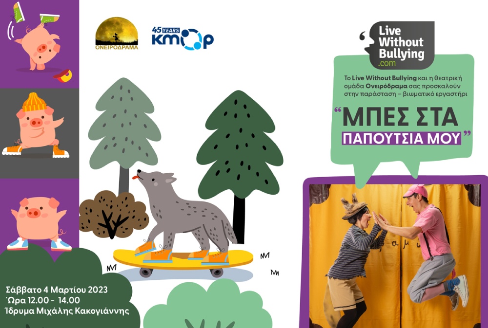 Η 6η Μαρτίου είναι η ημέρα αφιερωμένη κατά της σχολικής βίας και εκφοβισμού. Το Live Without Bulying ενώνει τις δυνάμεις του με τη θεατρική ομάδα Ονειρόδραμα και διοργανώνουν τη θεατρική παράσταση-βιωματικό εργαστήριο με τίτλο “Μπες στα παπούτσια”. Έπειτα από τη μεγάλη επιτυχία που γνώρισε, με sold out εμφανίσεις σε Αθήνα και Λονδίνο, η παράσταση επιστρέφει για μία ημέρα. Αυτήν τη φορά στο Ίδρυμα Μιχάλης Κακογιάνης στις 4 Μαρτίου.