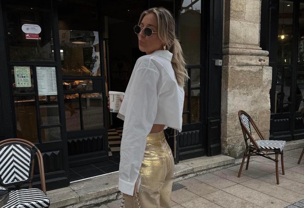 Τα shiny παντελόνια έχουν γίνει viral και συνδυάζονται τέλεια με ένα cropped λευκό πουκάμισο.