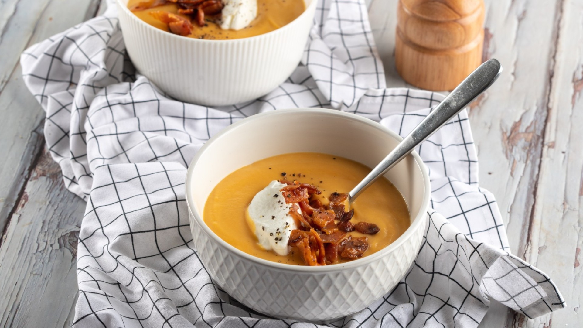 Η σούπα με γλυκοπατάτα και μπέικον συνδυάζει τη φυσική γλυκύτητα της γλυκοπατάτας με την αλμυρή, καπνιστή γεύση του μπέικον. Κρεμώδης και χορταστική, είναι ιδανική για ζεστά και απολαυστικά γεύματα.