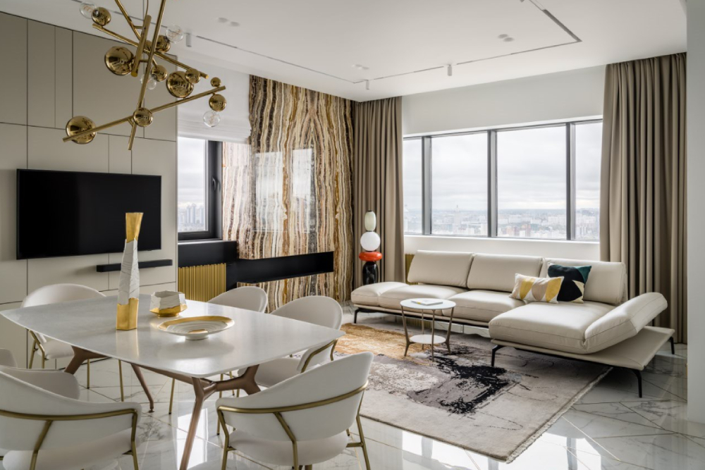 Η ομάδα του Alexander Tichler design studio, με lead designer την Karen Karapetian, σχεδίασε και παρέδωσε ένα φανταστικό διαμέρισμα για μία επιτυχημένη επιχειρηματία. Για το τελευταίο τους project συνδύασαν δύο δωμάτια στη δεξιά πλευρά του διαμερίσματος, ένα μεγάλο υπνοδωμάτιο με μπάνιο και χώρο εργασίας δίπλα στο παράθυρο. Το εσωτερικό του διαμερίσματος είναι κυρίως λευκό, αλλά είναι εξατομικευμένο με μερικές εξαιρετικές λεπτομέρειες. Για παράδειγμα, μεγάλο ενδιαφέρον παρουσιάζουν τα μπρούτζινα ένθετα της πορσελάνης Atlas Concorde με πλακάκια από πέτρα.