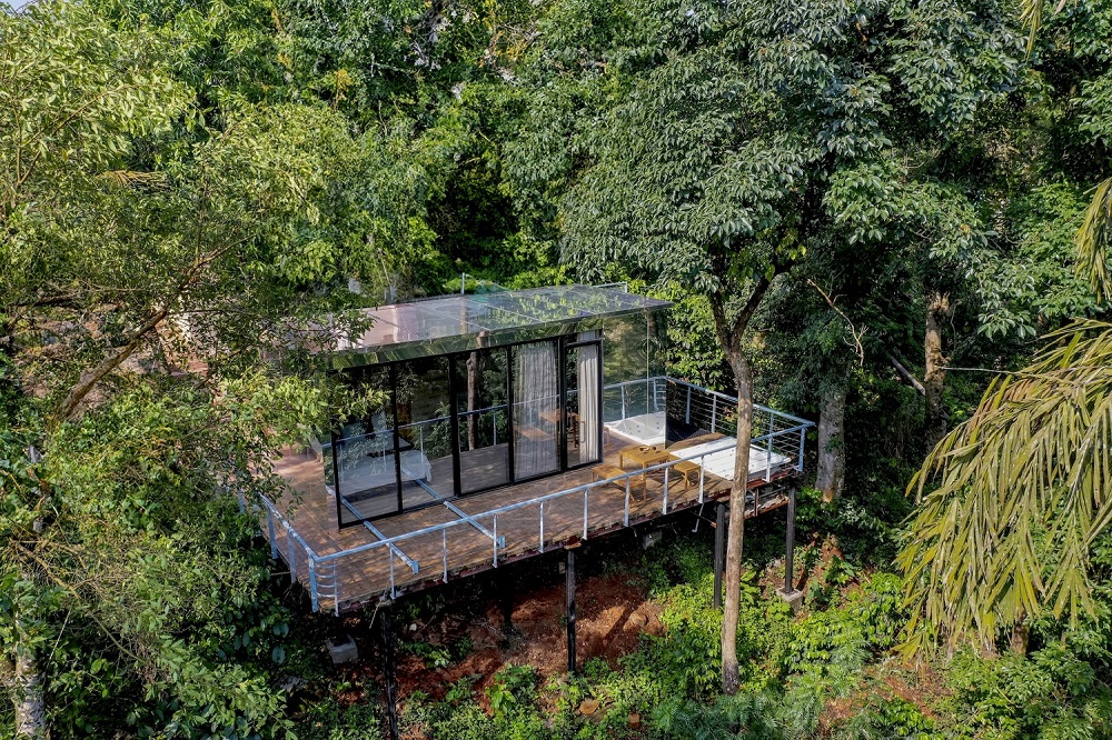 Το κατάστρωμα που προεξέχει από τη βάση δημιουργεί την αίσθηση ότι επιπλέετε ανάμεσα στα δέντρα, χαρίζοντας και φανταστική θέα. Ο χώρος του καθιστικού θολώνει τα όρια μεταξύ εσωτερικού και εξωτερικού χώρου. Οι γυάλινοι τοίχοι δημιουργούν την αίσθηση ότι η βλάστηση του δάσους ανήκει και στην οικία. Ένα υδρομασάζ στον εξωτερικό χώρο και ένα άνετο κρεβάτι, ιδανικά για παρατήρηση αστεριών, ολοκληρώνουν την καθηλωτική εμπειρία.