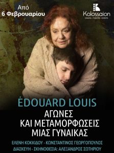 Στο Θέατρο Κολοσσαίον παρουσιάζεται από τις 6 Φεβρουαρίου 2026 το έργο «Αγώνες και μεταμορφώσεις μιας γυναίκας» του Εντουάρ Λουί, σε σκηνοθεσία Αλέξανδρου Σωτηρίου. Επί σκηνής, η Ελένη Κοκκίδου και ο Κωνσταντίνος Γεωργόπουλος ζωντανεύουν μια δυνατή ιστορία αγώνα, ταυτότητας και προσωπικής μεταμόρφωσης.