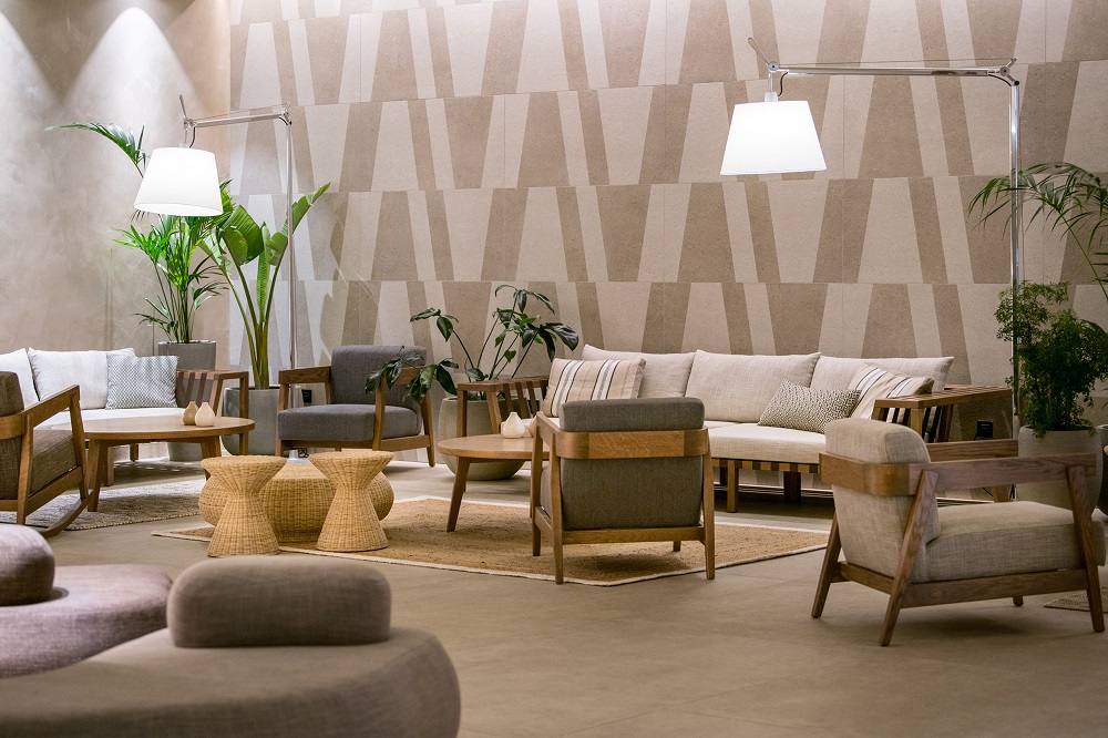 Όλοι οι ιδιωτικοί και δημόσιοι χώροι “ντύνονται” με γήινους χρωματικούς τόνους και φυσικά υλικά, ξύλινα γεωμετρικά μοτίβα και λαμπερά μεταλλικά στοιχεία από ορείχαλκο. Δημιουργούν μια ατμόσφαιρα εκλεπτυσμένης κομψότητας και απόλυτης χαλάρωσης. Ειδικά σχεδιασμένα ξύλινα διάτρητα στοιχεία χρησιμοποιούνται από την είσοδο στο lobby μέχρι και το πέρασμα στην εσωτερική αυλή, οργανώνοντας τον χώρο και φιλτράροντας το ηλιακό φως. Άλλο ένα κυρίαρχο στοιχείο του lobby αποτελεί ο πάγκος της reception από φυσικό πέτρωμα, που τοποθετείται μπροστά από μια εντυπωσιακή ξύλινη κατασκευή με το λογότυπο του ξενοδοχείου.