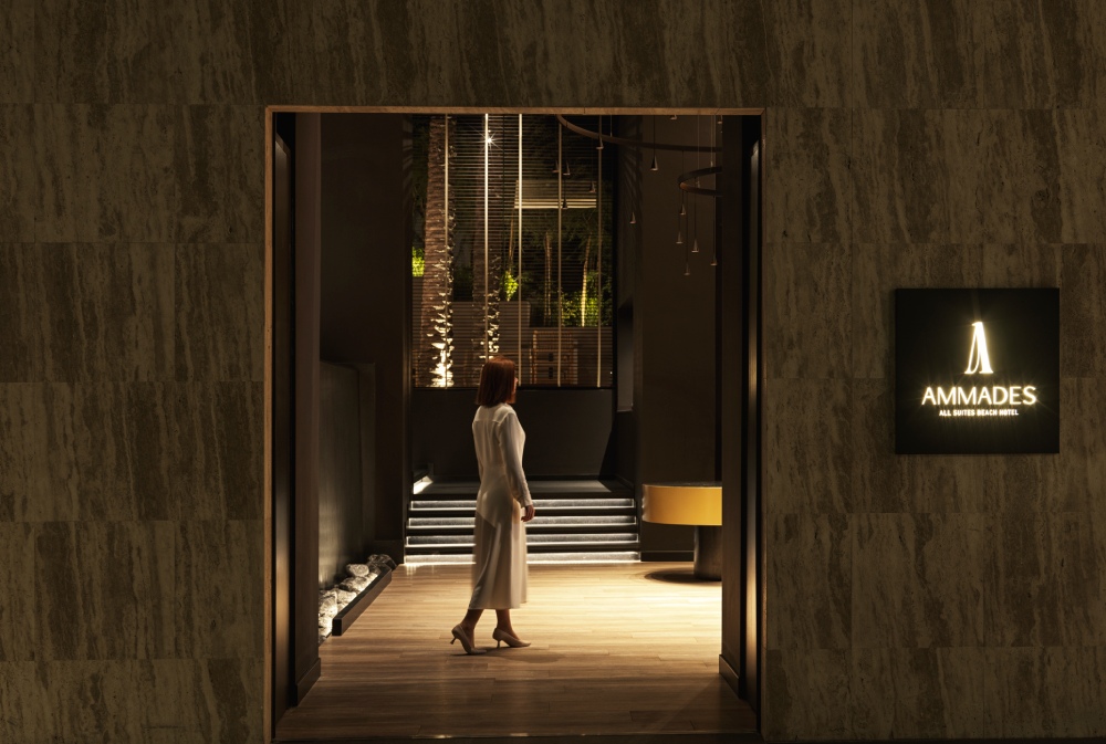 Μια βαθιά σκούρα απόχρωση του καφέ ντύνει όλους τους κοινόχρηστους χώρους, ενώ μαύρο γυαλί “κρύβει” την κεντρική είσοδο του ξενοδοχείου, κατορθώνοντας να προκαλέσει την έκπληξη. Την αίσθηση μυστηρίου ενισχύουν ακόμη περισσότερο η ατμοσφαιρική reception, που αγγίζει σε ύψος τα έξι μέτρα, και το φιλόξενο main lobby, που υποδέχεται τους επισκέπτες “ντυμένο” με εμβληματικά έπιπλα και έναν εντυπωσιακό μαύρο καταρράκτη! Με αυτές τις ευρηματικές επιλογές, ο interior designer Δημήτρης Παπαναστασίου αποδίδει πλήρως τη φιλοσοφία φιλοξενίας του Ammades, που υπόσχεται στους επισκέπτες του την απόλυτη εμπειρία χαλάρωσης.