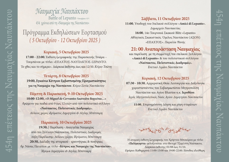20:30, Διάλεξη της ιστορικού – ερευνήτριας και ποιήτριας δρ. Νάσας Παταπίου με τίτλο «Κύπρος και Ναυμαχία της Ναυπάκτου».