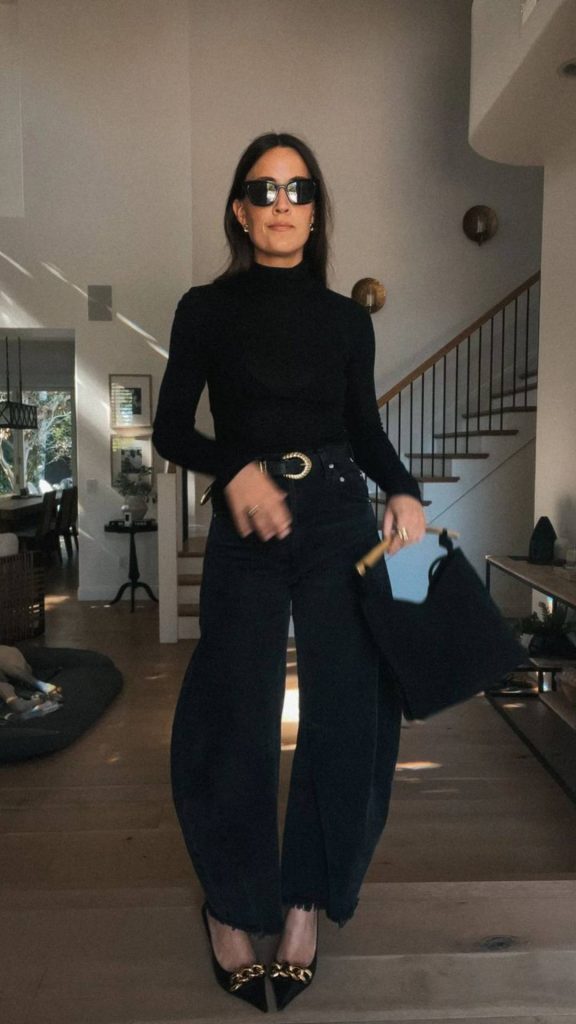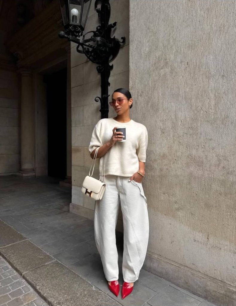 Επειδή τα barrel jeans προσθέτουν όγκο στους γοφούς και στους μηρούς, είναι σημαντικό να δημιουργείται ισορροπία στο σύνολο. Ένα εφαρμοστό top, ένα crop μπλουζάκι ή ένα κορμάκι μπορούν να αναδείξουν τη μέση και να δώσουν πιο θηλυκή γραμμή. Με αυτόν τον τρόπο αποφεύγεται η υπερβολική ένταση στο κάτω μέρος του σώματος και το αποτέλεσμα παραμένει κομψό. Για ένα πιο δομημένο outfit, ένα oversized σακάκι σε συνδυασμό με basic τοπ δημιουργεί ένα σύγχρονο, minimal αποτέλεσμα ιδανικό για το γραφείο ή τις βόλτες στην πόλη.
