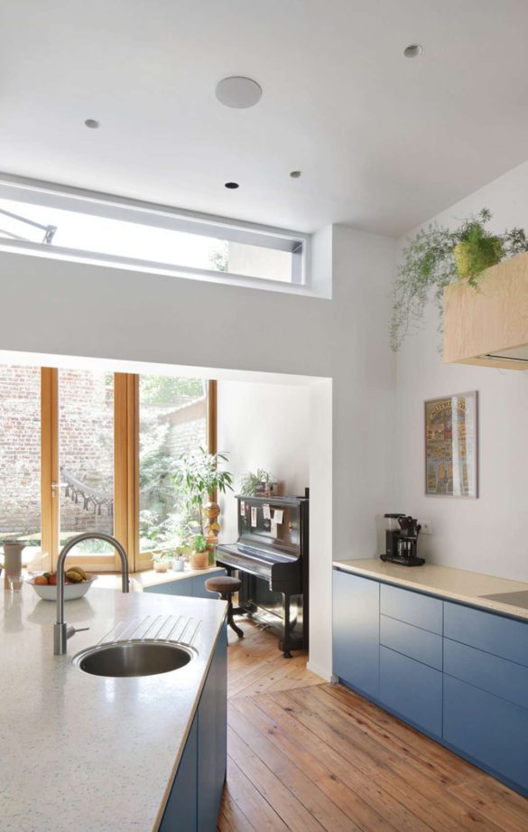 Οι υφιστάμενες επεκτάσεις κατεδαφίστηκαν και αντικαταστάθηκαν από μια νέα, διαπλατυνόμενη προσθήκη στο ισόγειο, η οποία ανοίγεται προς τον κήπο μέσα από μεγάλα γυάλινα πάνελ, ενώ η κεκλιμένη στέγη ενισχύει τη χωρική εμπειρία και επιτρέπει την εισαγωγή φεγγίτη στο κυρίως κτίριο, οδηγώντας το φως βαθύτερα στο εσωτερικό. Παράλληλα, ο κήπος αποστρώνεται εν μέρει και φυτεύεται, λειτουργώντας πλέον ως φυσική προέκταση του καθιστικού.