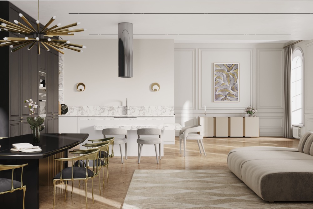 Η τραπεζαρία θεωρείται το πιο πολυτελές μέρος του σπιτιού από Caffe Latte. Οι κλασικοί τόνοι ενώνονται με το μαύρο ματ και το σμαραγδένιο πράσινο. Στο master bedroom κυριαρχούν οι μαύροι, χρυσαφί, μπλε και μπορντό τόνοι. Ένας καθρέπτης, εμπνευσμένος από τα μέσα του αιώνα κλέβει την παράσταση. Στο γραφείο υιοθετήθηκε ένας έξυπνος σχεδιασμός, παίζοντας με τους όγκους και τον φωτισμό.