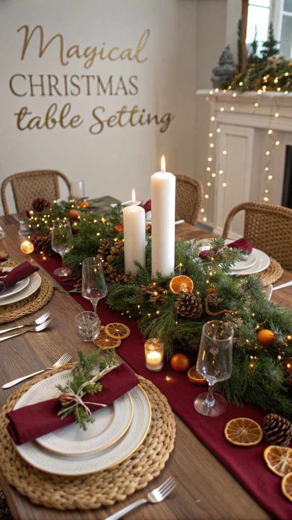 Τα φυσικά υλικά φέρνουν αυτόματα τη χριστουγεννιάτικη ατμόσφαιρα στο τραπέζι σου, χωρίς να χρειάζεσαι πολλά διακοσμητικά. Μπορείς να χρησιμοποιήσεις κλαδάκια πεύκου ή έλατου κατά μήκος του τραπεζιού, να προσθέσεις κουκουνάρια, μπαστουνάκια κανέλας ή αστεροειδή γλυκάνισο και να ολοκληρώσεις με αποξηραμένες φέτες πορτοκαλιού. Μικρά κλαδάκια δεμένα γύρω από τις πετσέτες με σπάγκο ή κορδέλα δίνουν έξτρα πόντους στη συνολική εικόνα. Όλα αυτά προσθέτουν άρωμα, υφή και μια αυθεντική «χειμωνιάτικη» αίσθηση.