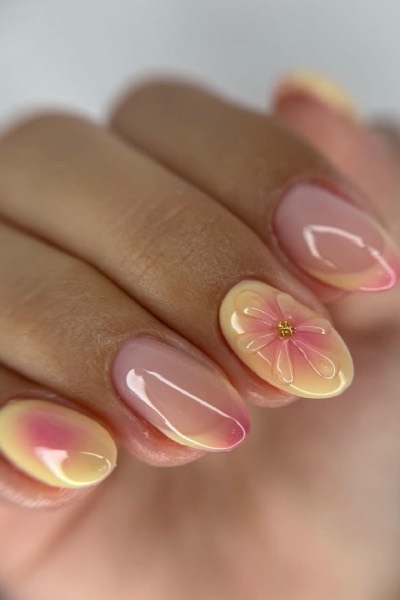 Soft lemon-pink ombré manicure with delicate 3D floral accent