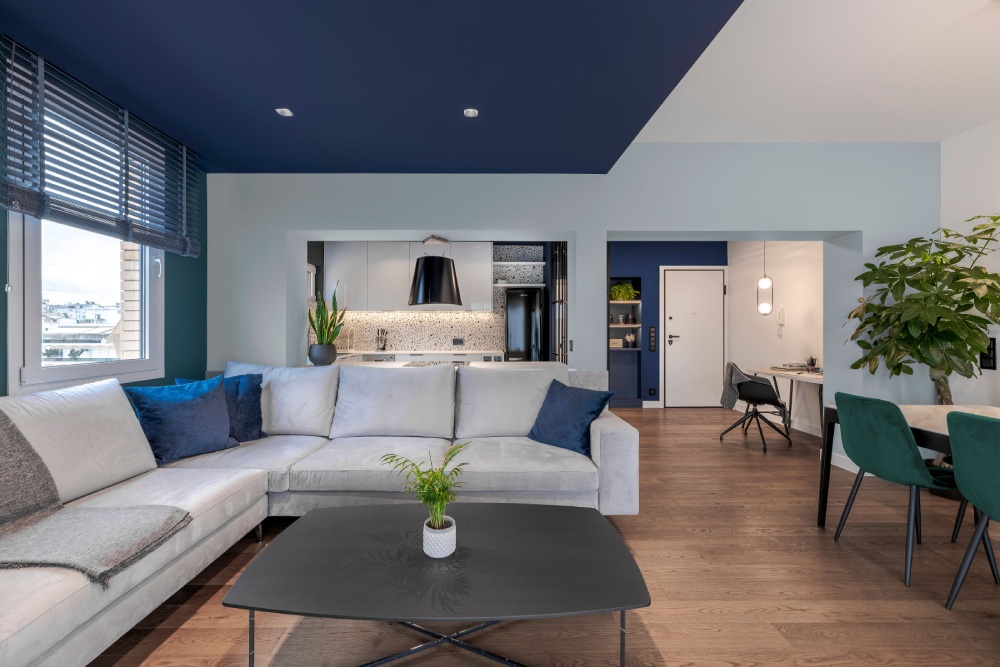 Σε κάθε δωμάτιο του διαμερίσματος κυριαρχεί και ένα διαφορετικό χρώμα, κάτι που προσδίδει μία παιχνιδιάρικη διάθεση ανακάλυψης. Αντλώντας έμπνευση από την απρόσκοπτη θέα του καθιστικού στο άλσος Νέας Σμύρνης, οι lab.arCH architects έφεραν τα χρώματα της φύσης μέσα στους χώρους του διαμερίσματος. Έτσι, στους χώρους διημέρευσης επιλέχθηκαν τόνοι του πράσινου και του μπλε, ως μια νοητή συνέχεια της εικόνας που εκτυλίσσεται έξω από τα μεγάλα παράθυρα του διαμερίσματος.