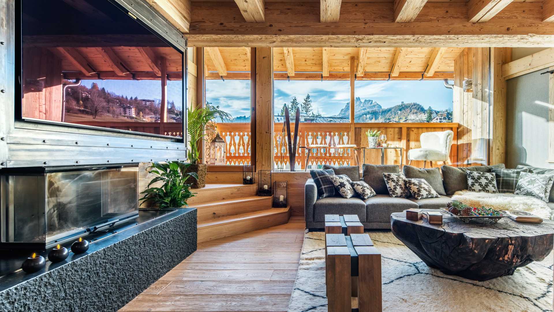 Παράλληλα, η μοντέρνα εστία γίνεται οπτικό επίκεντρο, οδηγώντας το βλέμμα προς τα ξύλινα σκαλοπάτια και τη θέα των Δολομιτών, ενώ η συνέχεια του ίδιου λίθου στον πάγκο της κουζίνας και στο μπάνιο των επισκεπτών εξασφαλίζει οπτική συνοχή και ισορροπία.