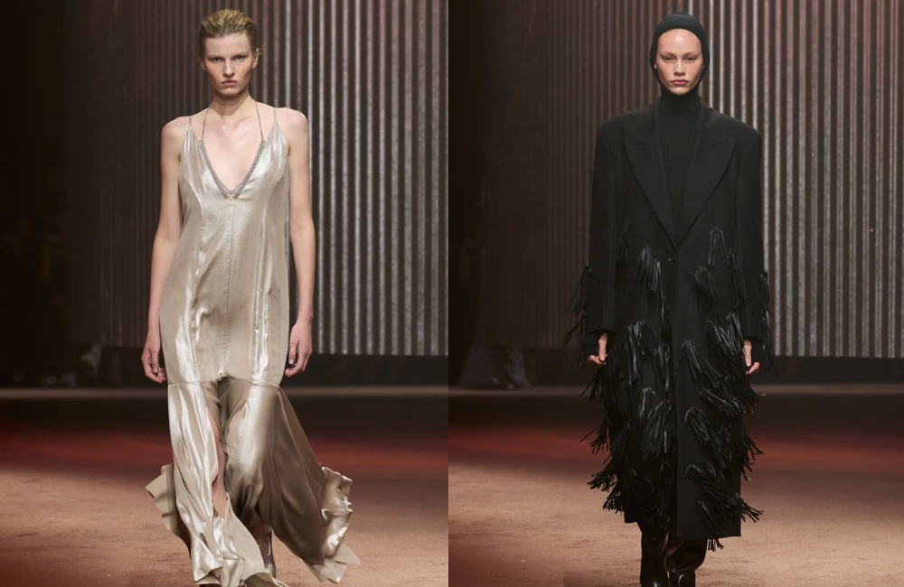 Ασύμμετρα wraps σε knitwear, εκλεπτυσμένες σιλουέτες παντελονιών και sleep προσθήκες σε elevated tailoring. Ένα από τα highlights της συλλογής είναι σίγουρα τα tuxedo, στολισμένα με μεταξωτές φαρδιές λεπτομέρειες. Ακόμα και εδώ κάνουν την εμφάνισή τους τα silver κομμάτια, αποδεικνύοντας ότι η disco mania θα μας ακολουθήσει και το φθινόπωρο.