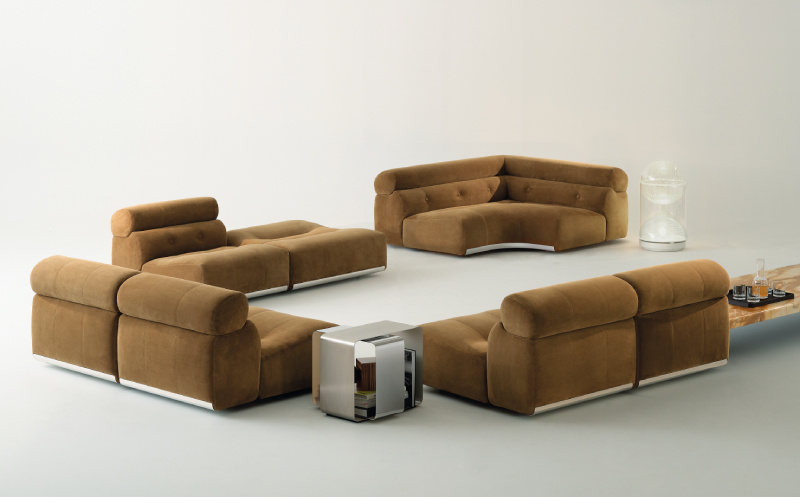 Το σύστημα διακρίνεται για την υψηλή του ευελιξία, επιτρέποντας πληθώρα διαμορφώσεων: από μεμονωμένα κομμάτια μέχρι πολυμορφικές συνθέσεις που μπορούν να προσαρμοστούν σε διαφορετικές αισθητικές και αρχιτεκτονικές ανάγκες. Ξεχωρίζει ιδιαίτερα ο καναπές με διπλή κλίση, ένα τολμηρό αλλά απολύτως ισορροπημένο στοιχείο, το οποίο υπογραμμίζεται από έναν κυρτό μεταλλικό σκελετό – διαθέσιμο είτε σε βερνικωμένη είτε σε βουρτσισμένη, γυαλισμένη εκδοχή – που περιβάλλει το κάθισμα τόσο στο μπροστινό όσο και στο πίσω μέρος. Ο σκελετός αυτός δεν είναι απλώς προστατευτικός: είναι στοιχείο αναγνωριστικής ταυτότητας, που ενισχύει τη συνολική σιλουέτα και προσδίδει στο Coupé τον χαρακτήρα ενός design icon.