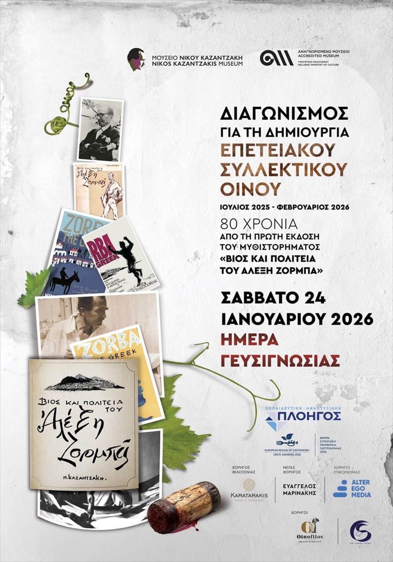Το Μουσείο Νίκου Καζαντζάκη, με αφορμή τα 80 χρόνια από την έκδοση του εμβληματικού μυθιστορήματος «Ο Βίος και η Πολιτεία του Αλέξη Ζορμπά», προχώρησε στη δημιουργία ενός συλλεκτικού οίνου, στο πλαίσιο του θεσμού «Κρήτη, Ευρωπαϊκή Περιφέρεια Γαστρονομίας 2026».