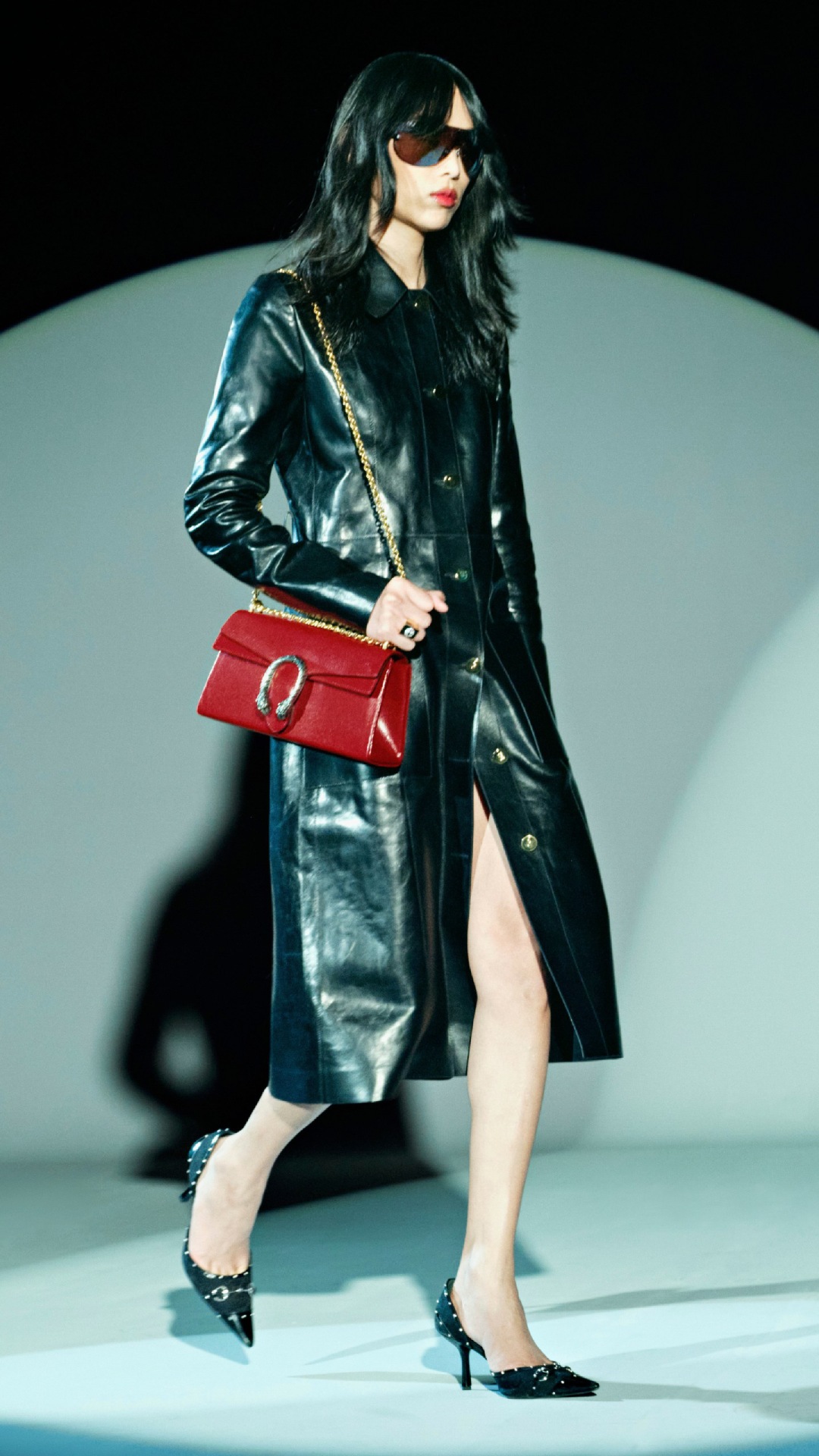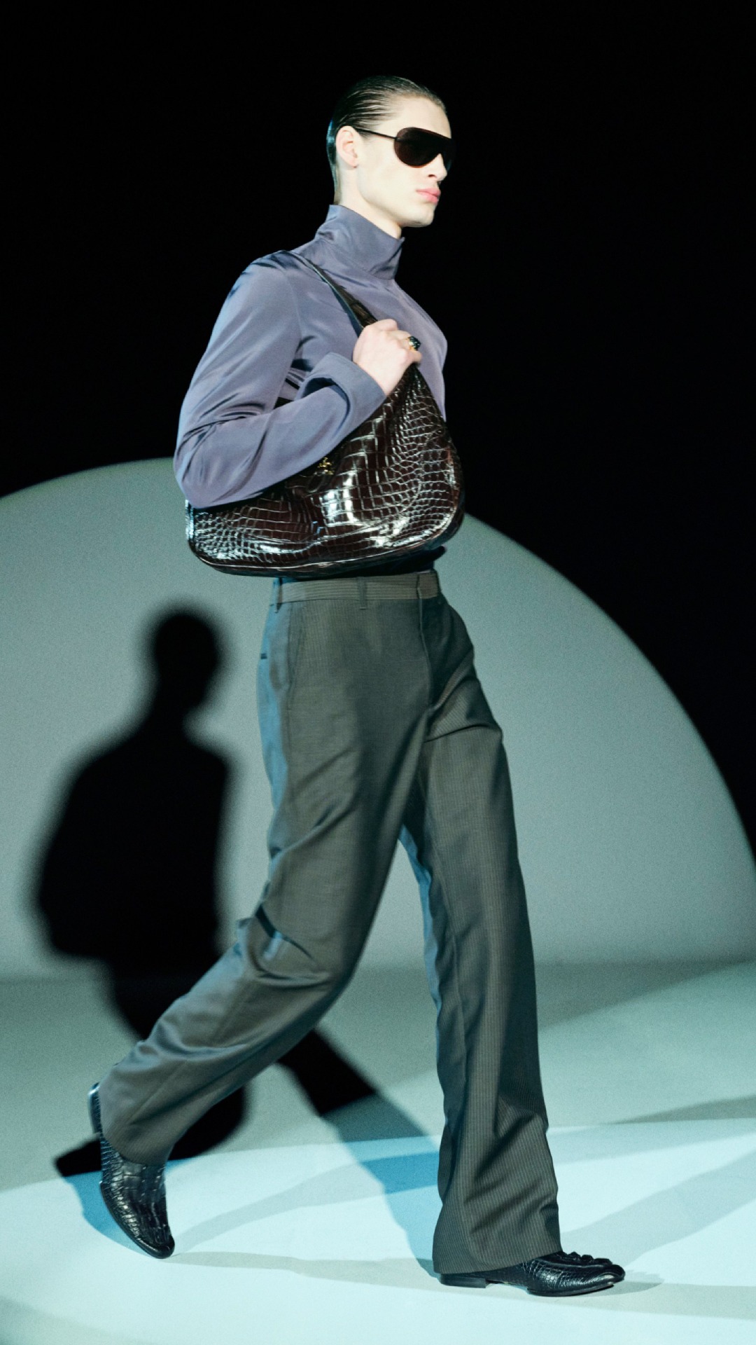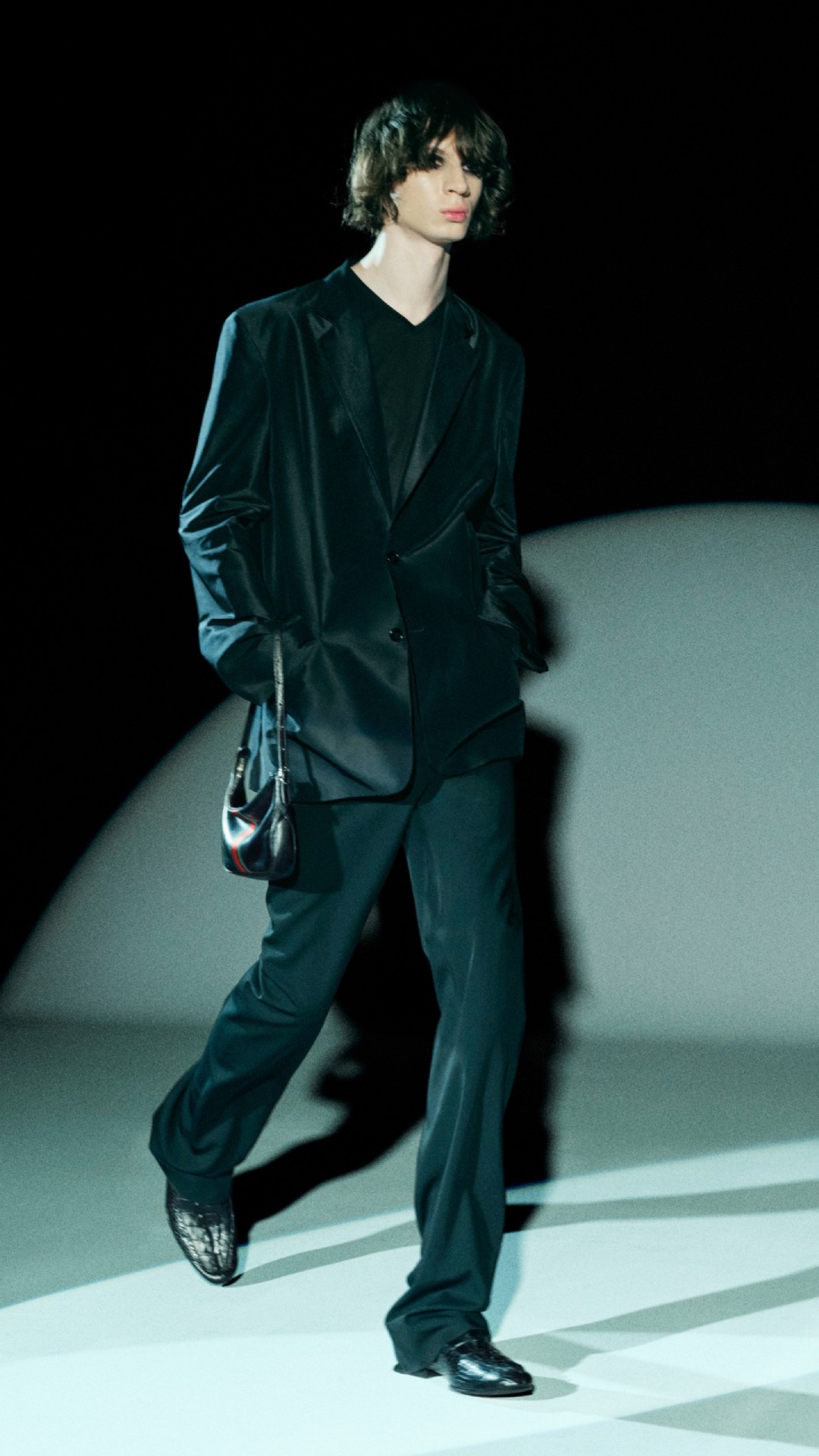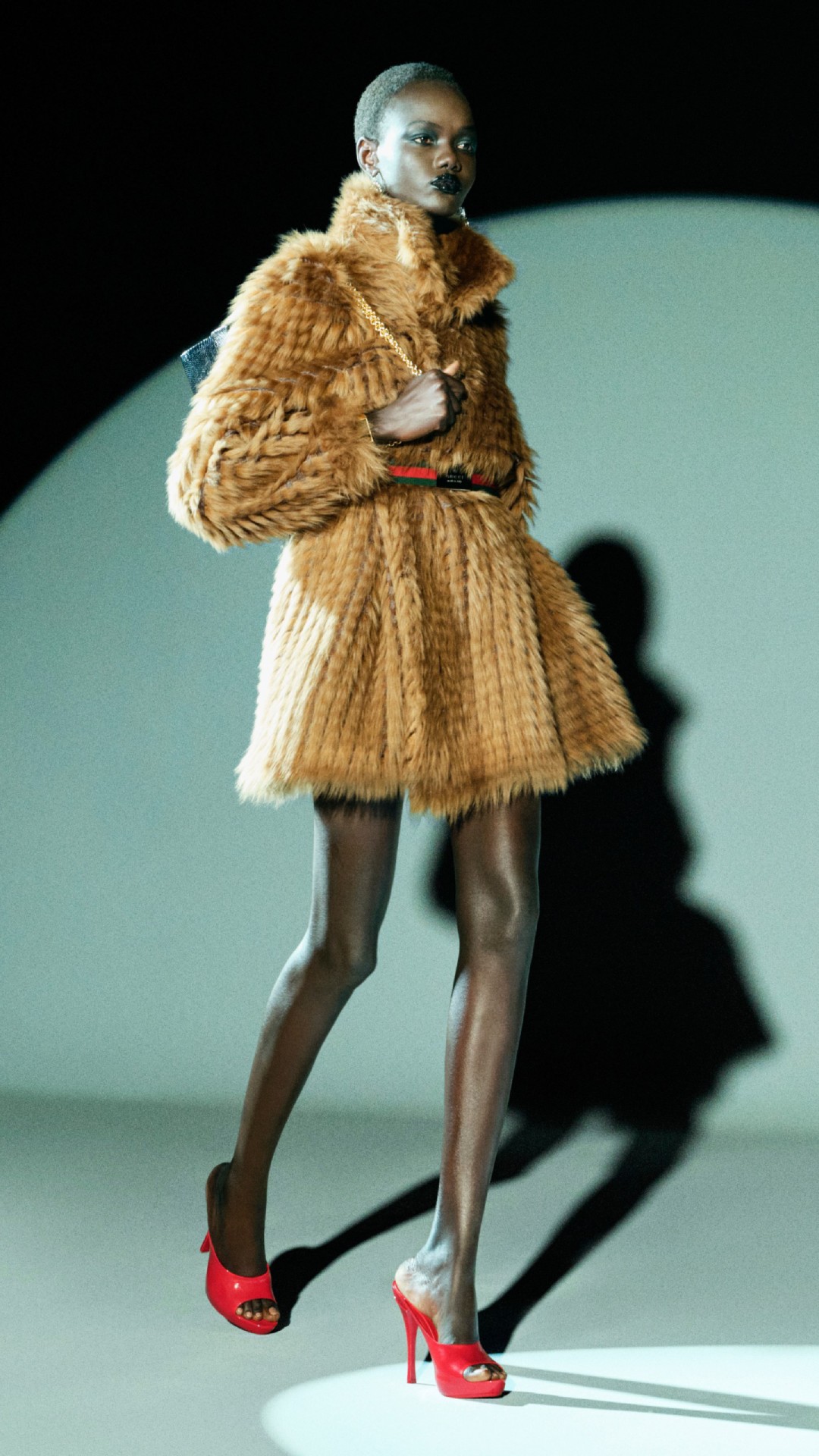 Η εκδοχή του Demna για τις χνουδωτές υφές, δηλαδή παλτά που συνδύαζαν shearling, φτερά και λωρίδες μουσελίνας, αλλά που παρέμεναν εξαιρετικά ελαφριά.  «Για μένα, αυτό είναι πολυτέλεια», είπε, καλώντας έναν επισκέπτη να ζυγίσει τα κομμάτια. Η ελαφρότητα ήταν όντως προτεραιότητα για τον σχεδιαστή τόσο στα ρούχα όσο και στα αξεσουάρ, τα οποία περιλάμβαναν νέες εκδοχές της τσάντας Jackie 1961. μια πιο κομψή, πιο γεωμετρική ερμηνεία του στυλ Dionysus που εισήγαγε ο προκάτοχος Alessandro Michele. Και μυτερές μπαλαρίνες «που ήθελα πάντα να έχω, οπότε τις φτιάξαμε σε ανδρικό μέγεθος», είπε ο ίδιος.