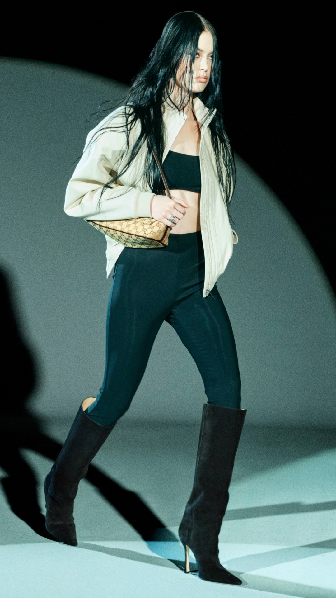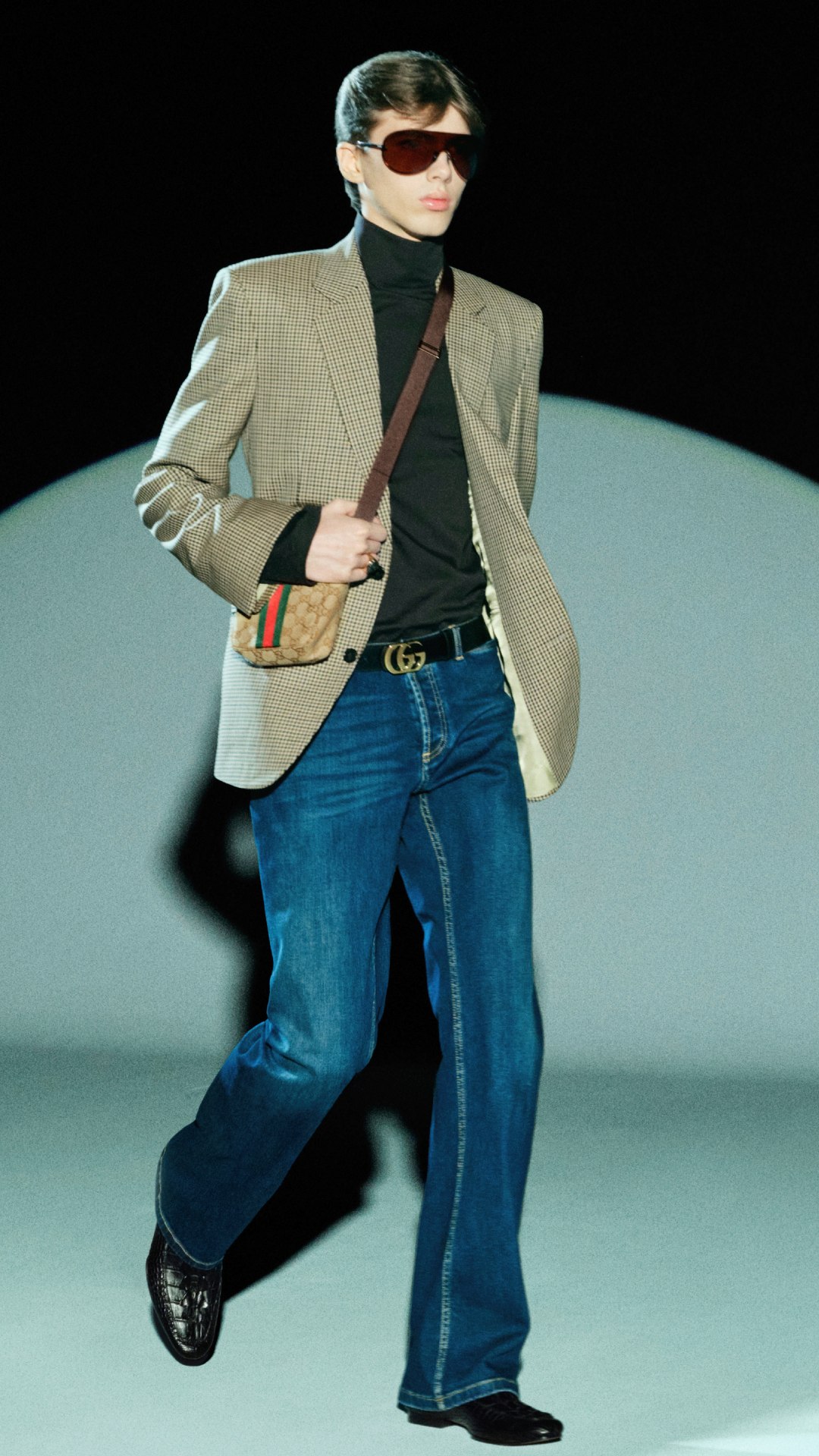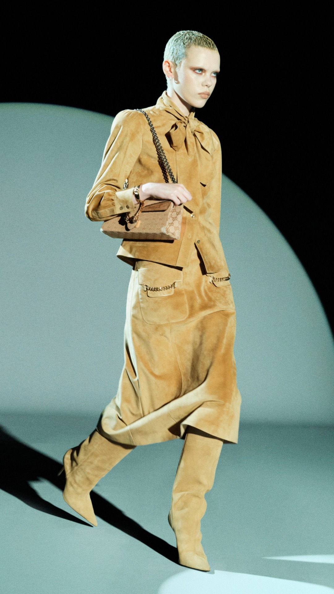 Συνέχισε να βασίζεται στα ’70s και στους κώδικες της Gucci, όπως το μονόγραμμα GG και οι ρίγες Web εδώ και εκεί. Όμως, ο Demna εμβάθυνε τη γοητεία του για την Gucci του Φορντ και υιοθέτησε μια μινιμαλιστική προσέγγιση.