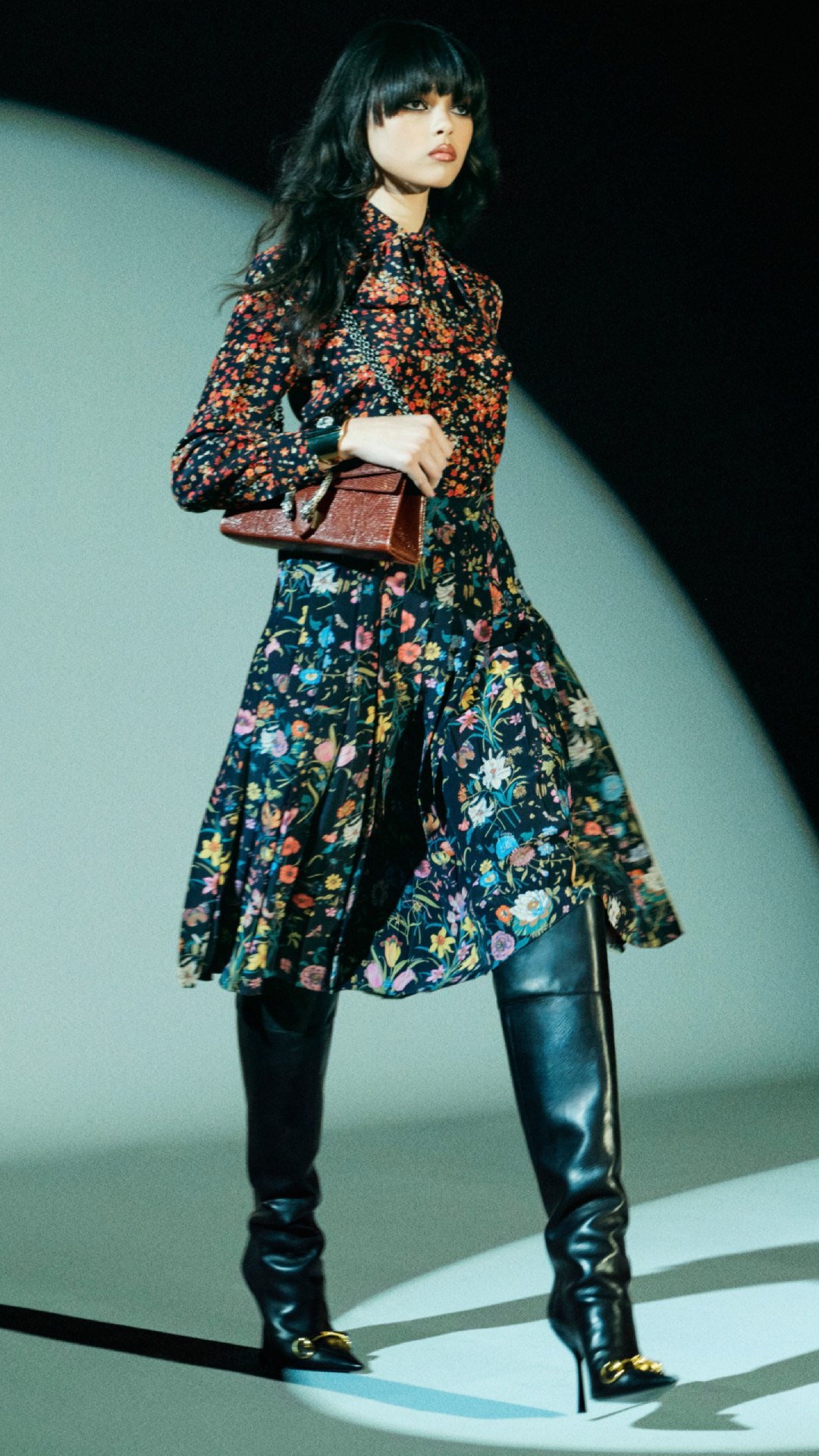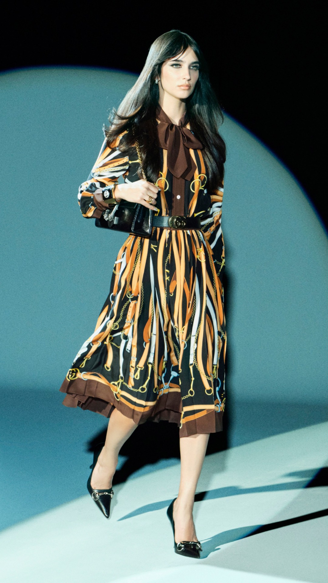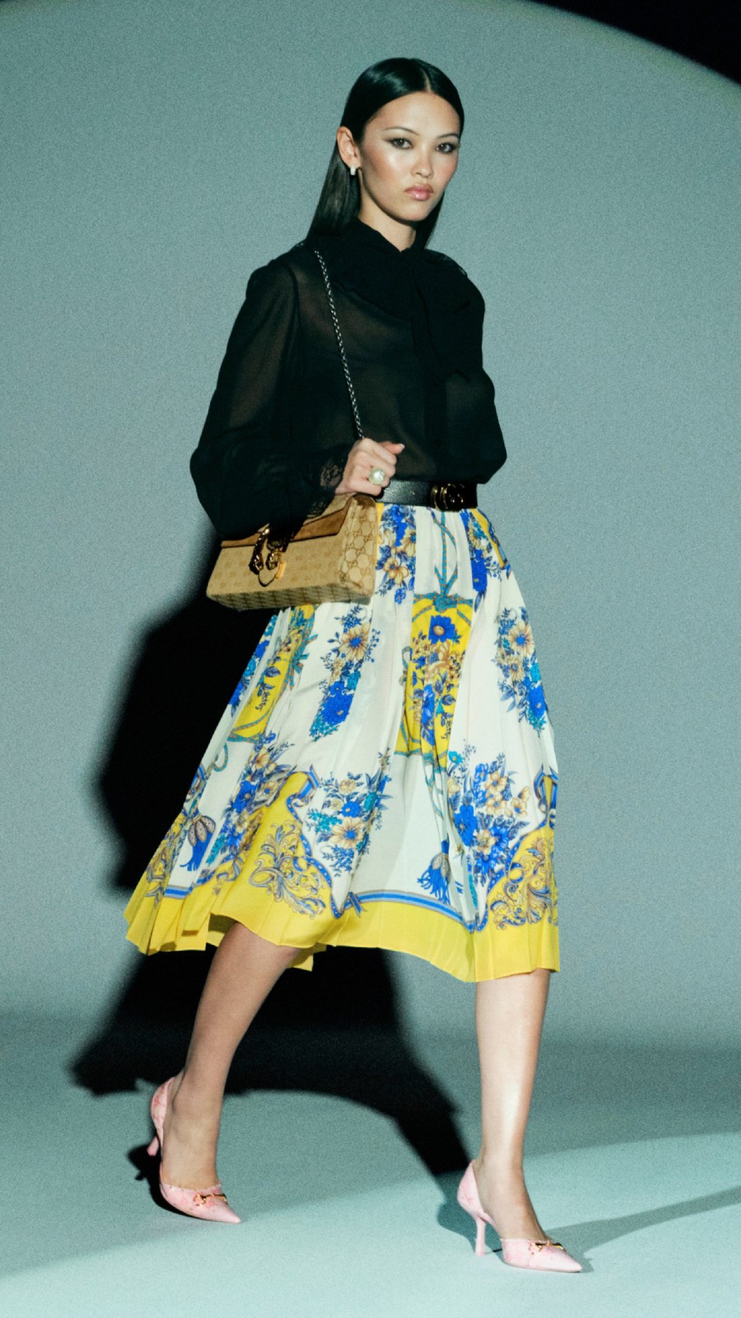 Ακόμη και τα κομμάτια που προσανατολίζονται περισσότερο προς τα ’70s, όπως οι μπλούζες με φιόγκο στο λαιμό (pussy-bow), οι floral πλισέ φούστες και τα μεταξωτά φορέματα-μαντήλια με έμπνευση από την ιππασία, είχαν ένα αισθησιακό υπόβαθρο μέσω των πλαϊνών σκισιμάτων.
