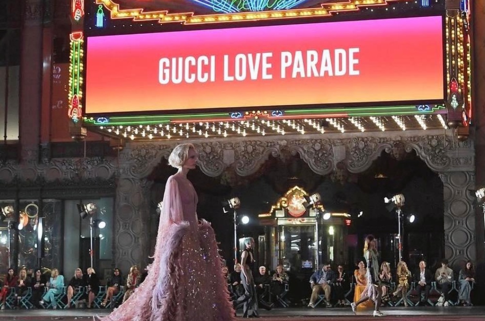 Ήταν μια χολιγουντιανή φαντασία που έγινε πραγματικότητα. Πάνω από το θέατρο El Capitan αναβόσβηνε το motto της συλλογής. Gucci Love Parade. Ο σχεδιαστής πάντα αγαπούσε να φτιάχνει κοστούμια και είχε ανέκαθεν μεγάλη αγάπη για το Hollywood. Και μέσα από αυτό το show τιμήθηκε και κάθε του συνεργασία. Από τον Elton John, τον Jared Leto, την Miley Cyrus, τον Harry Styles και άλλους πολλούς.