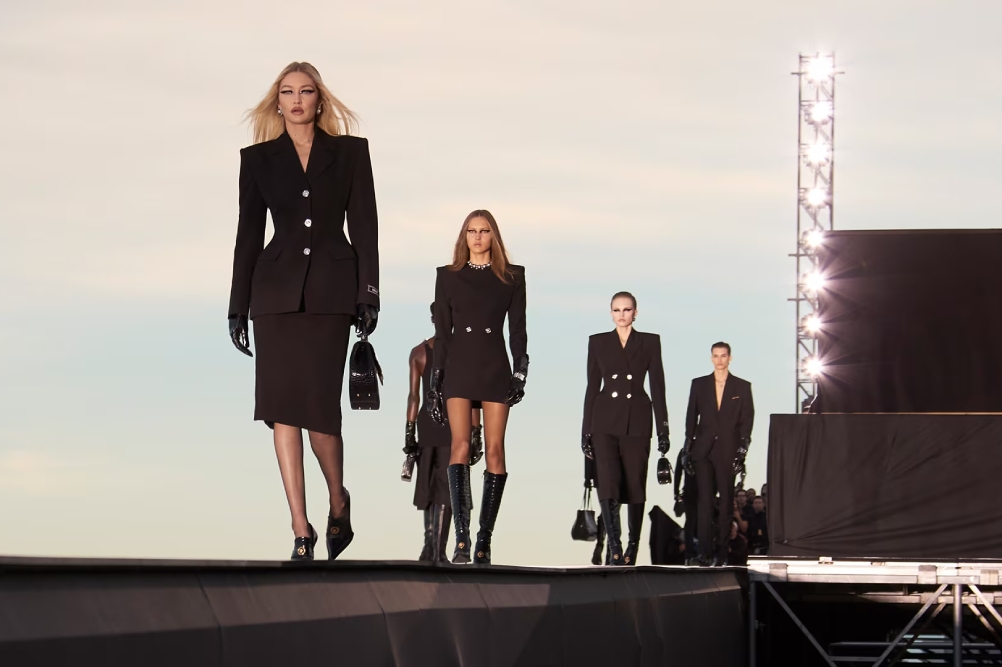 Η Versace έκανε στροφή 180 μοιρών, παρουσιάζοντας μία διαφορετική -για τα δεδομένα του οίκου- συλλογή. Οι δημιουργίες της FW2023 εμπνεύστηκαν από την ενέργεια, τη γοητεία και τη δύναμη του Hollywood. Το runway έφερε στο προσκήνιο δυναμικά looks, τα οποία συνδύασαν αριστοτεχνικά τη “χρυσή εποχή” του brand με τις σύγχρονες τάσεις του σήμερα.