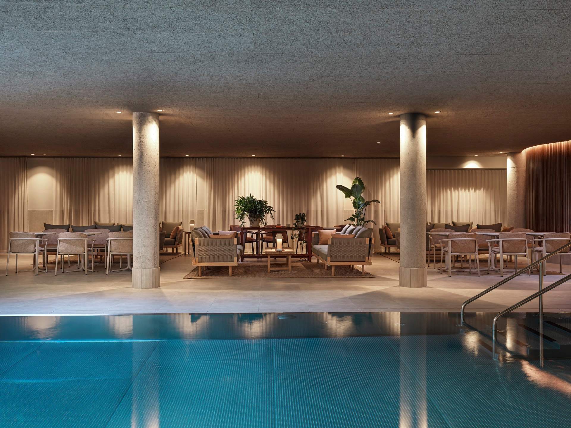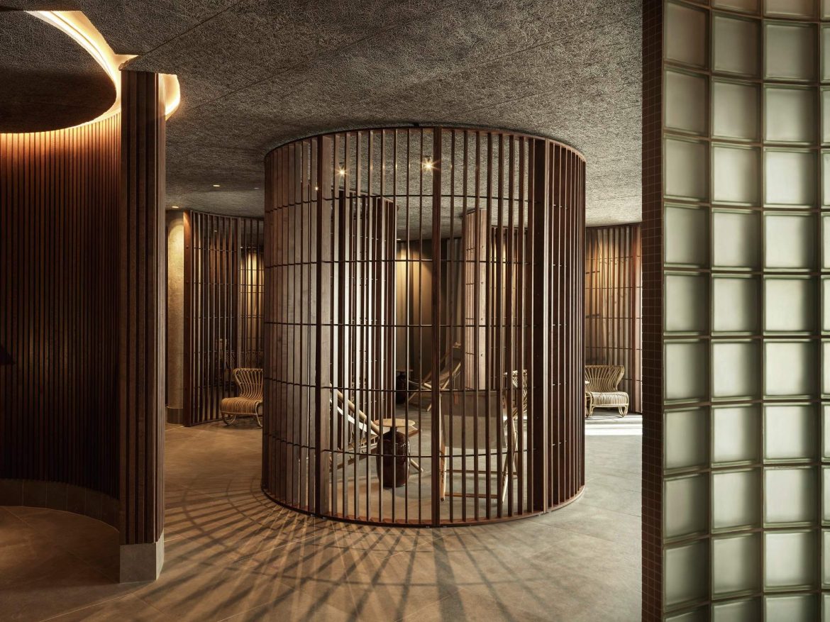 Ωστόσο, το πιο εντυπωσιακό στοιχείο του Hagastrand είναι αναμφίβολα το νέο spa, που αποτελεί και τον πυρήνα όλης της σχεδιαστικής πρότασης. Εδώ η αρχιτεκτονική μετατρέπεται σε εμπειρία! Καμπύλες φόρμες, απαλές αντιθέσεις φωτός και σκιάς, υλικά που καλούν σε άγγιγμα και εξερεύνηση δημιουργούν μια διαδρομή που κινείται ανάμεσα στη ζεστασιά και τη δροσιά, στην κοινωνικότητα και την εσωστρέφεια. Το spa λειτουργεί ως ένα σύγχρονο λουτρό ευεξίας, όπου ο χρόνος επιβραδύνεται και το σώμα επανέρχεται σε φυσικούς ρυθμούς. Είναι ταυτόχρονα οργανικό και μυσταγωγικό, με σαφή αναφορά στη σκανδιναβική παράδοση των λουτρικών τελετουργιών.