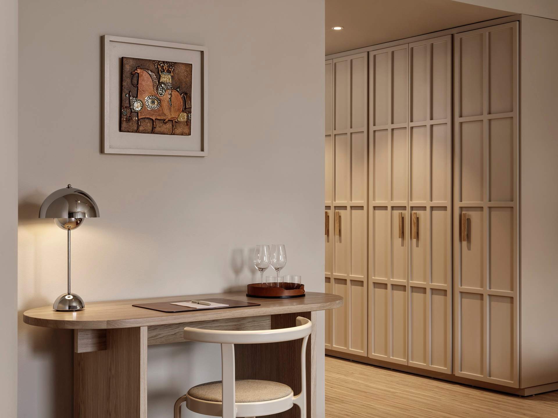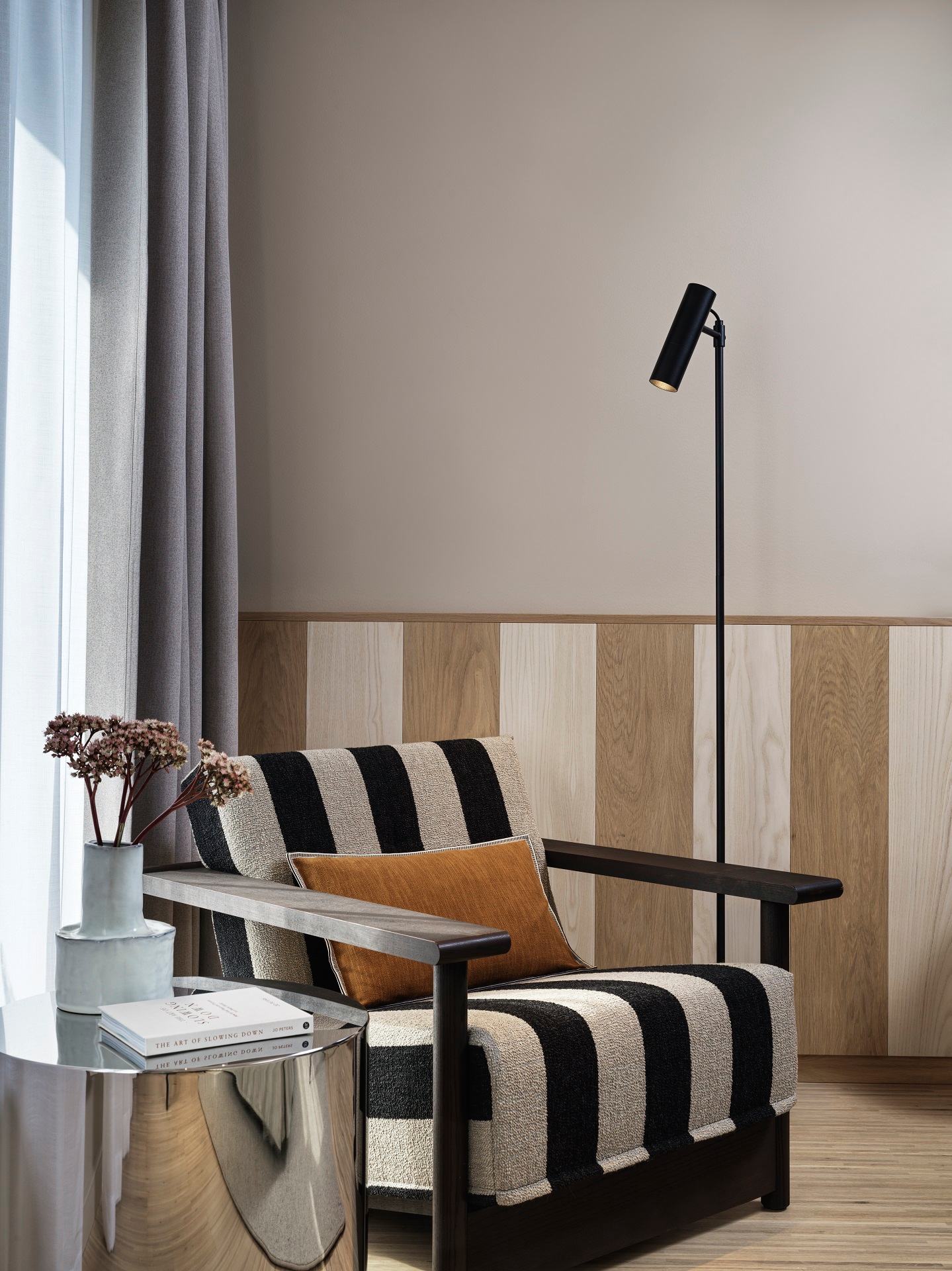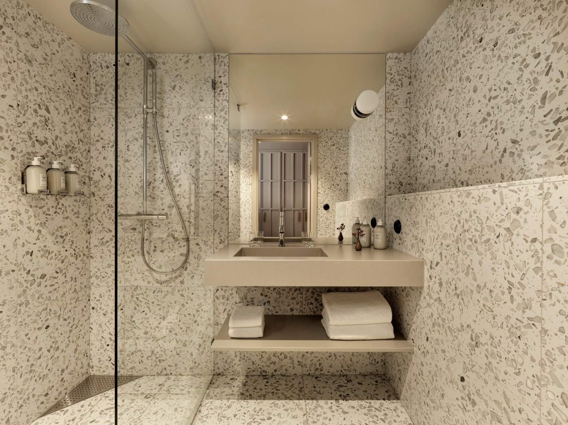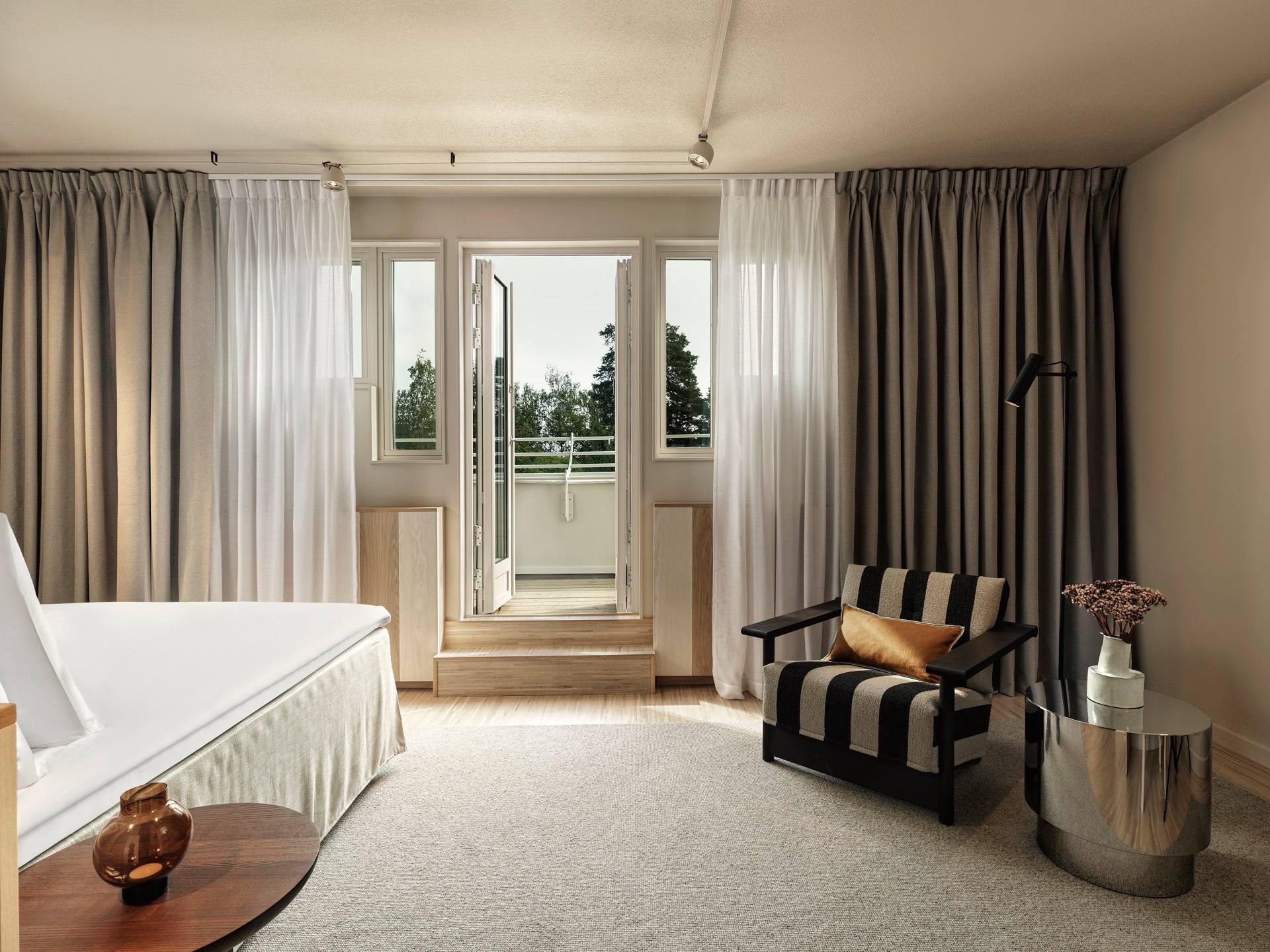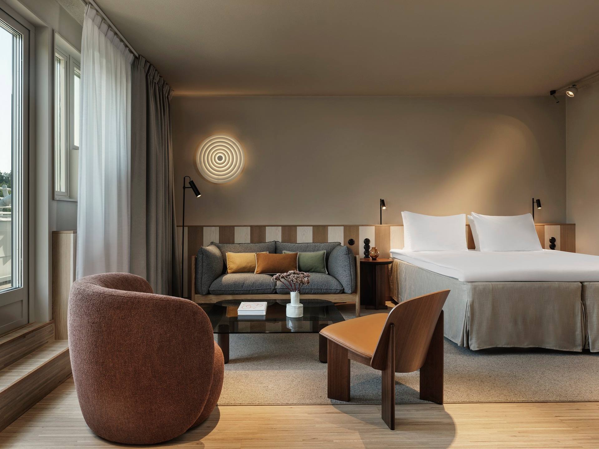 Τα 215 δωμάτια του ξενοδοχείου συνεχίζουν αυτή τη γλώσσα σχεδιασμού, αλλά με πιο προσωπική διάθεση. Οι Wingårdhs τα οραματίστηκαν ως ήρεμα καταφύγια, όπου ο επισκέπτης αποσύρεται για να βρει ισορροπία. Στερεή δρύινη ξυλεία, μάλλινες υφές και terrazzo συνθέτουν μια υλικότητα διαχρονική, που παραπέμπει σε μια νέα εκδοχή της σκανδιναβικής λιτότητας – όχι ψυχρή ούτε minimal, αλλά ζεστή, μελετημένη και σχεδόν χειροποίητη. Οι γραμμικές ξύλινες επενδύσεις στους τοίχους δημιουργούν μια συνέχεια με τους κοινόχρηστους χώρους, ενώ παράλληλα ανανεώνουν οπτικά τα δωμάτια, δίνοντάς τους καθαρό, σύγχρονο χαρακτήρα.