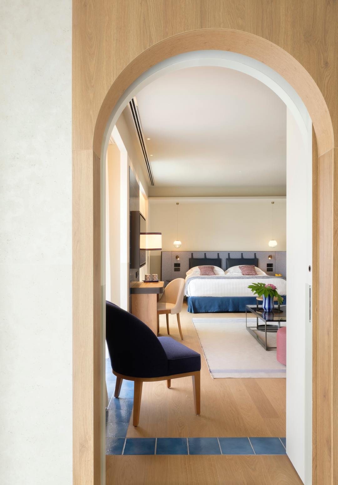 Σε αυτό το περιβάλλον εκλεπτυσμένης απλότητας, η Listone Giordano συμβάλλει καθοριστικά στη διαμόρφωση της ατμόσφαιρας των εσωτερικών χώρων. Η επιλογή του δαπέδου, σε ματ δρυ με φυσική ελαιώδη επεξεργασία, προσδίδει στους χώρους ζεστασιά και αυθεντικότητα. Η απόχρωση, εμπνευσμένη από τα ξύλα των παραδοσιακών σκαφών, παραπέμπει διακριτικά στον ναυτικό χαρακτήρα της περιοχής και στη σχέση της με τη θάλασσα.