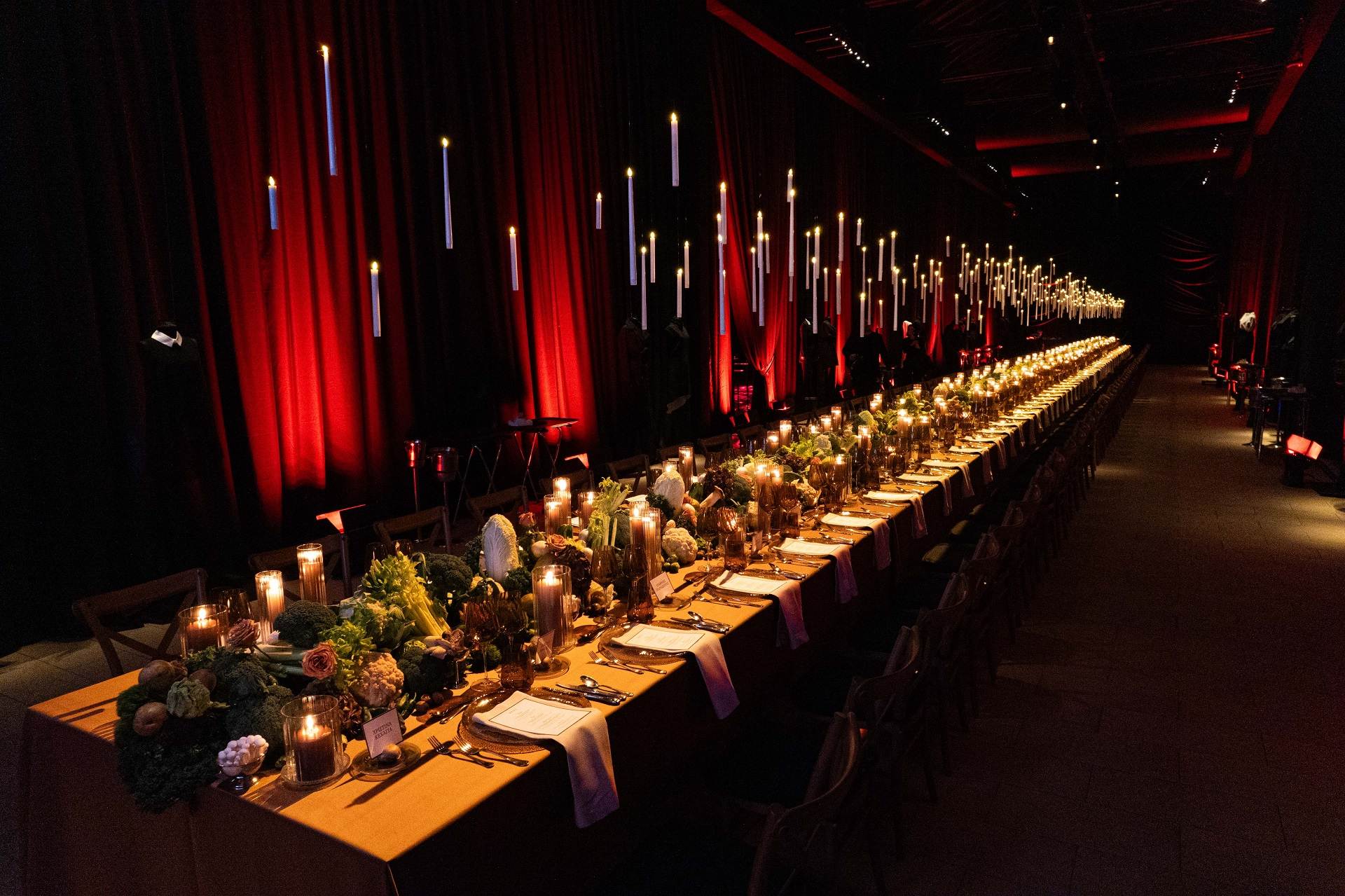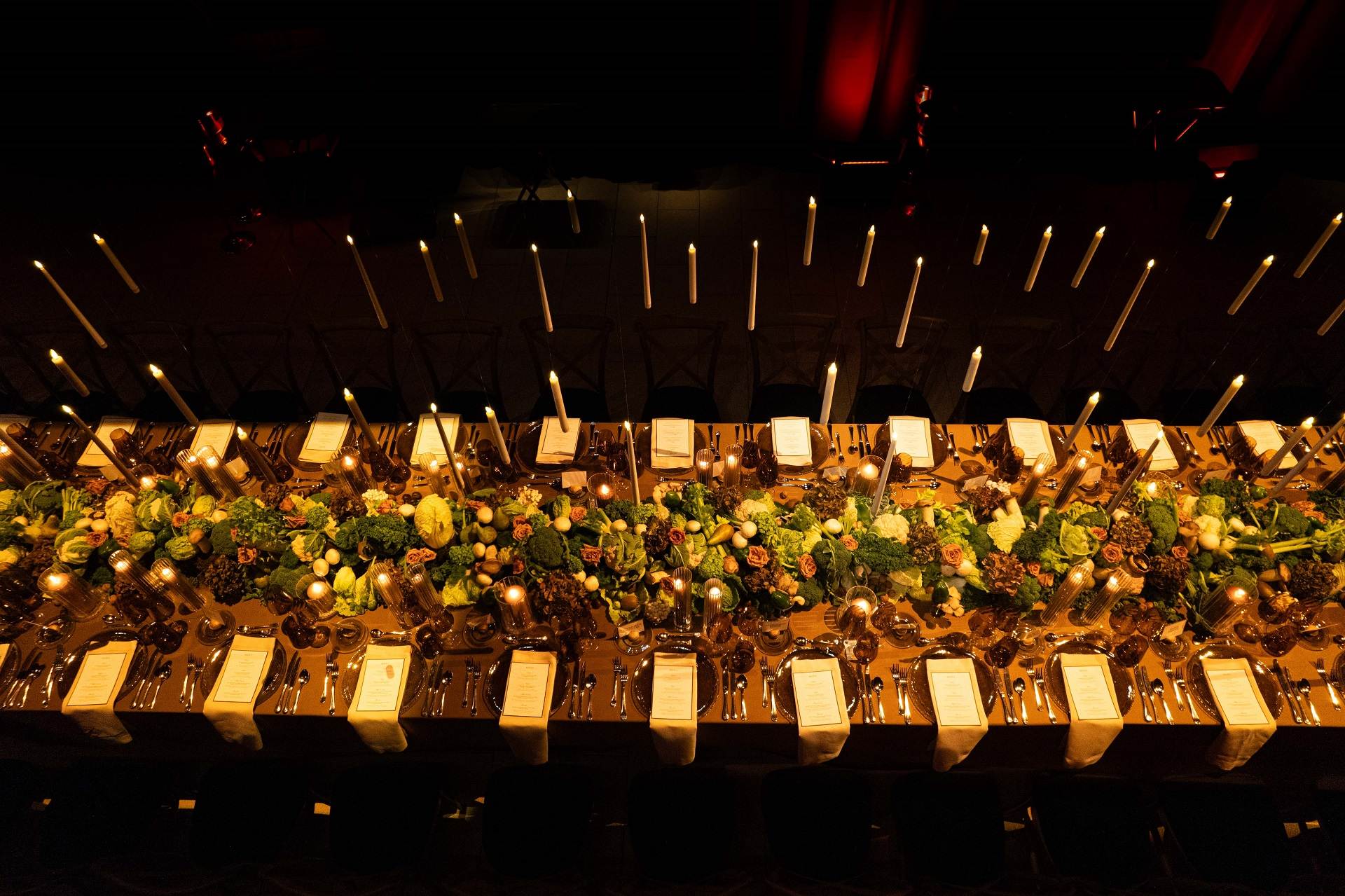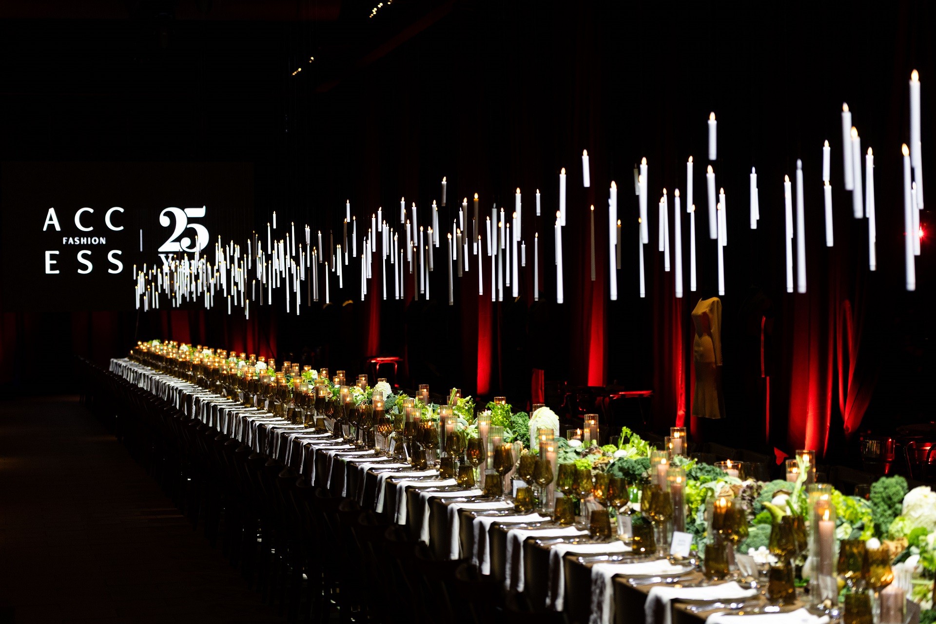 Το δείπνο δόθηκε σε ένα ενιαίο τραπέζι μήκους 32 μέτρων, φωτισμένο από εκατοντάδες αιωρούμενα LED κεριά. Ως φυσικό centerpiece χρησιμοποιήθηκαν βιολογικά λαχανικά, μια διακριτική αλλά σαφής αναφορά στη βιώσιμη φιλοσοφία της ACCESS Fashion, η οποία επενδύει σταθερά στην υπεύθυνη μόδα, με περίπου το ένα τρίτο της συλλογής της να σχεδιάζεται από βιώσιμες πρώτες ύλες.