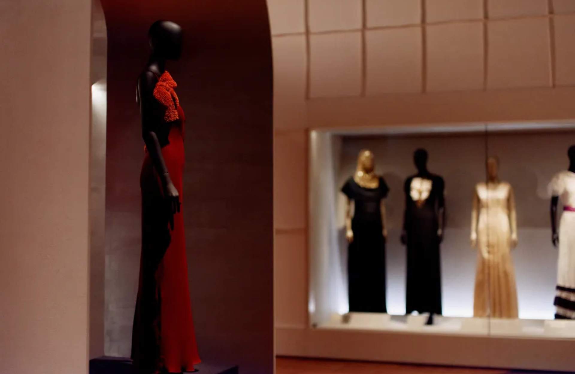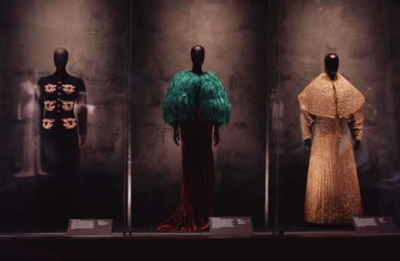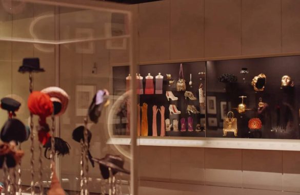 Στην έκθεση παρουσιάζονται περισσότερα από 400 αντικείμενα, μεταξύ των οποίων εντυπωσιακά φορέματα, έργα τέχνης, κοσμήματα και αρχειακό υλικό. Ξεχωρίζουν δημιουργίες όπως το “Skeleton Dress”, ένα φόρεμα με ανάγλυφα «οστά», αλλά και το “Lobster Dress”, αποτέλεσμα συνεργασίας με τον Dalí, που αποτυπώνει τη δημιουργική ανταλλαγή ιδεών ανάμεσα σε σχεδιαστή και καλλιτέχνη.