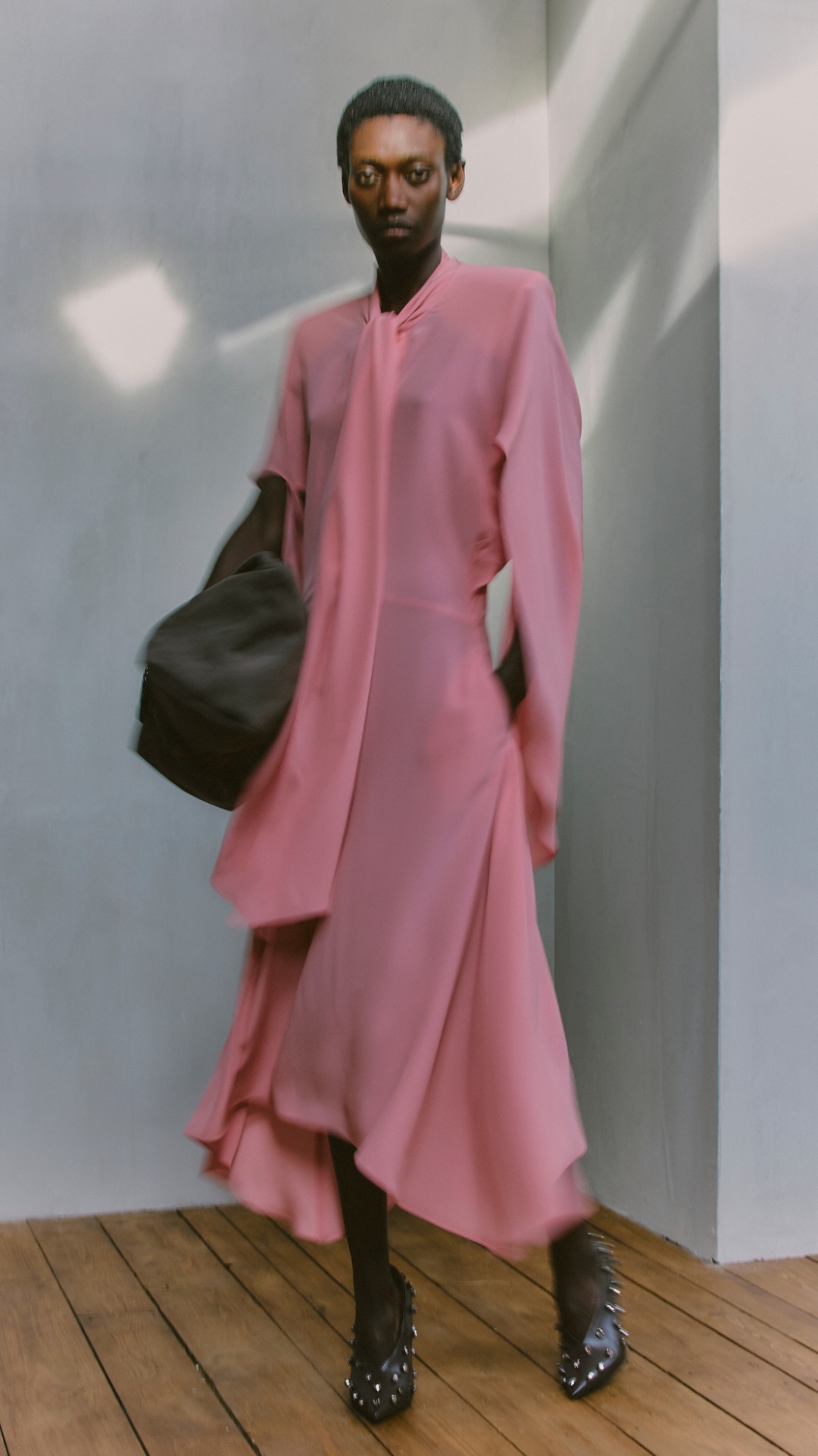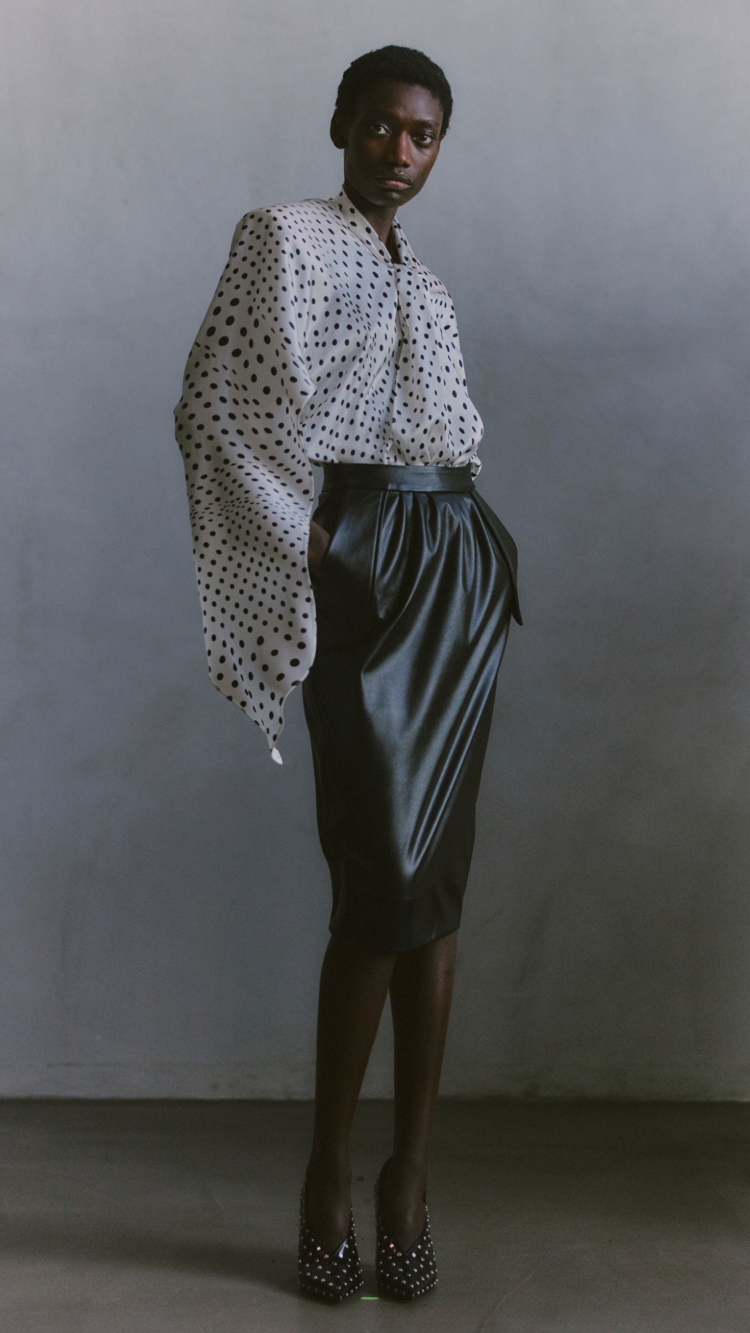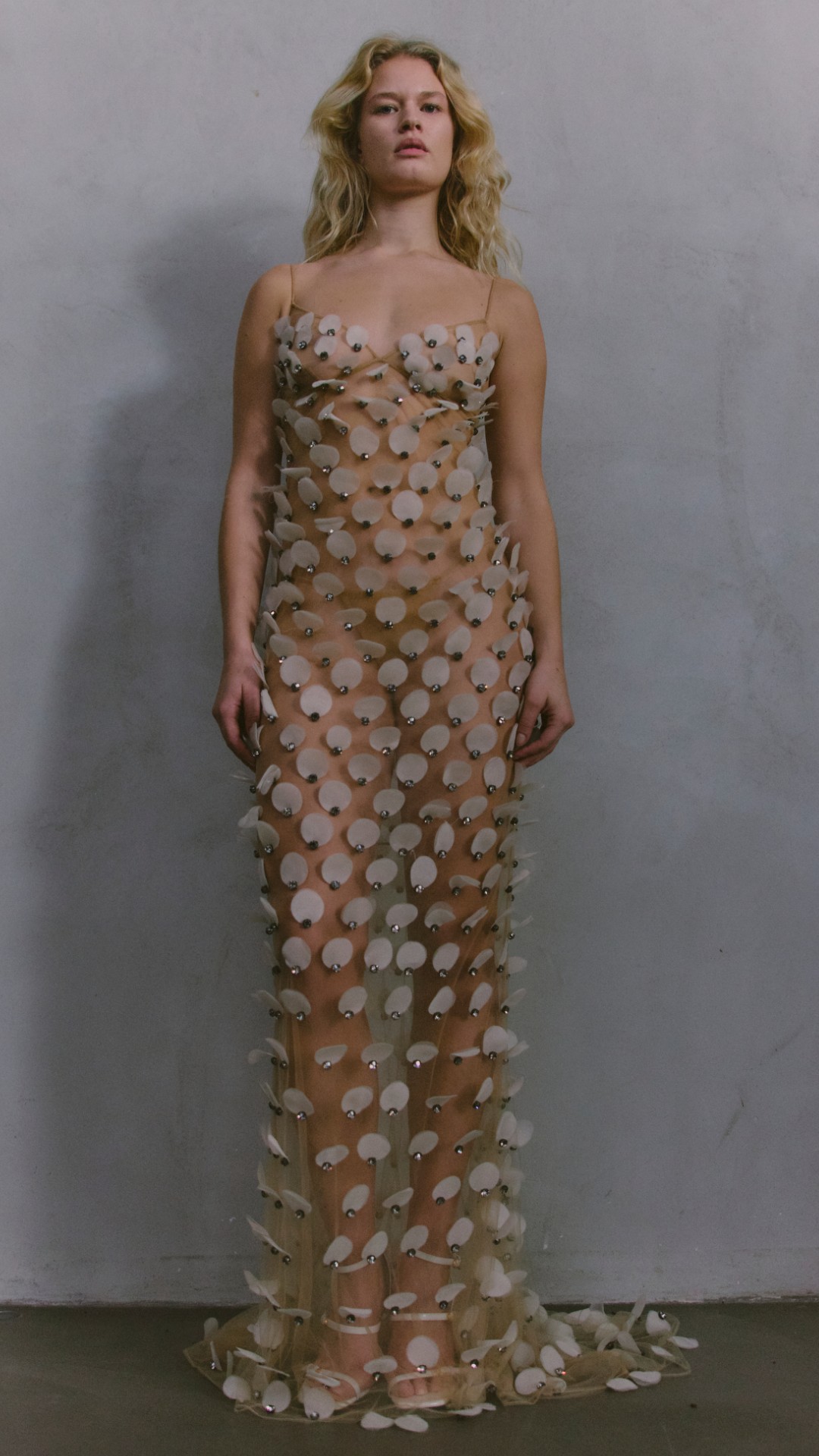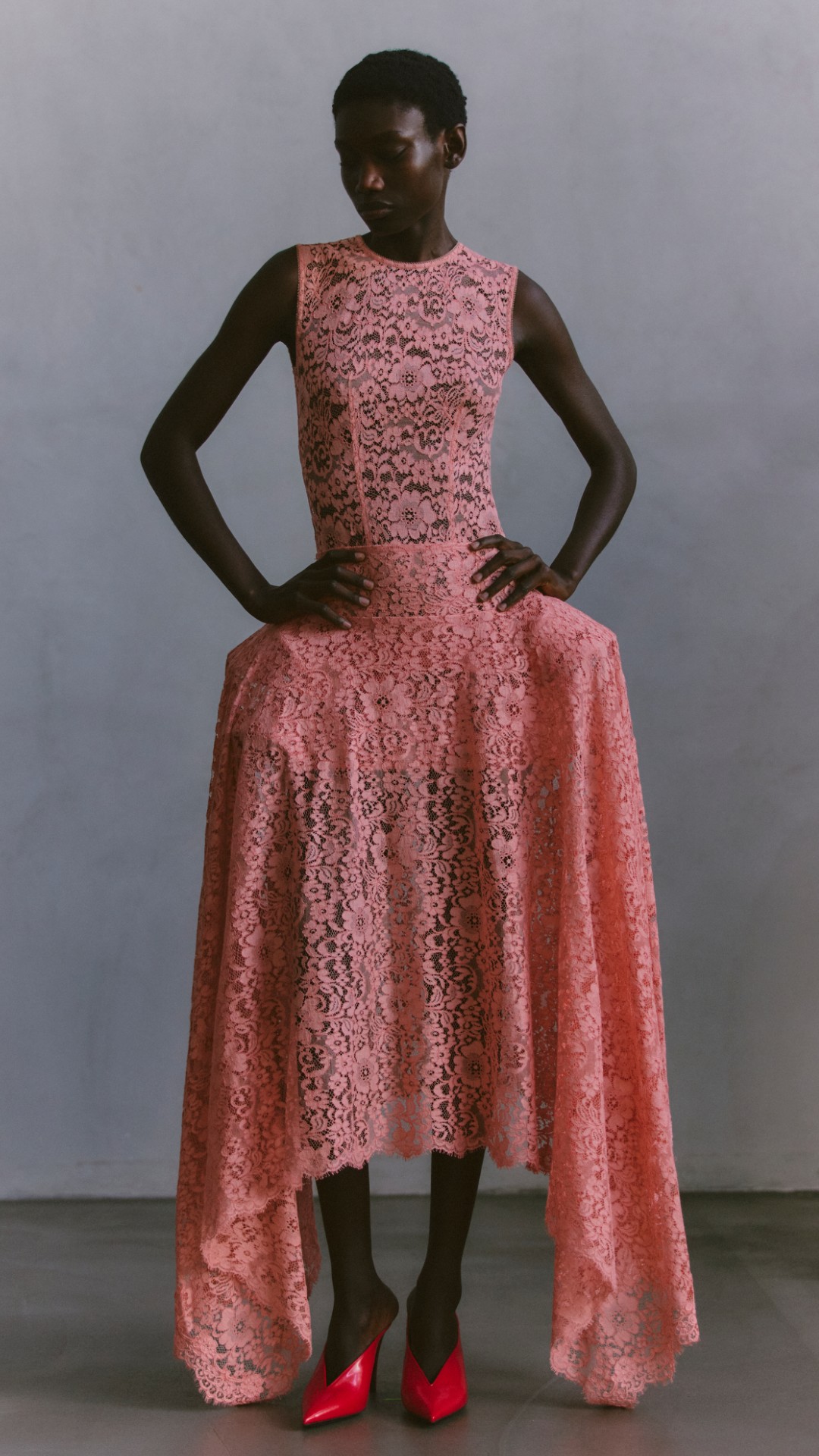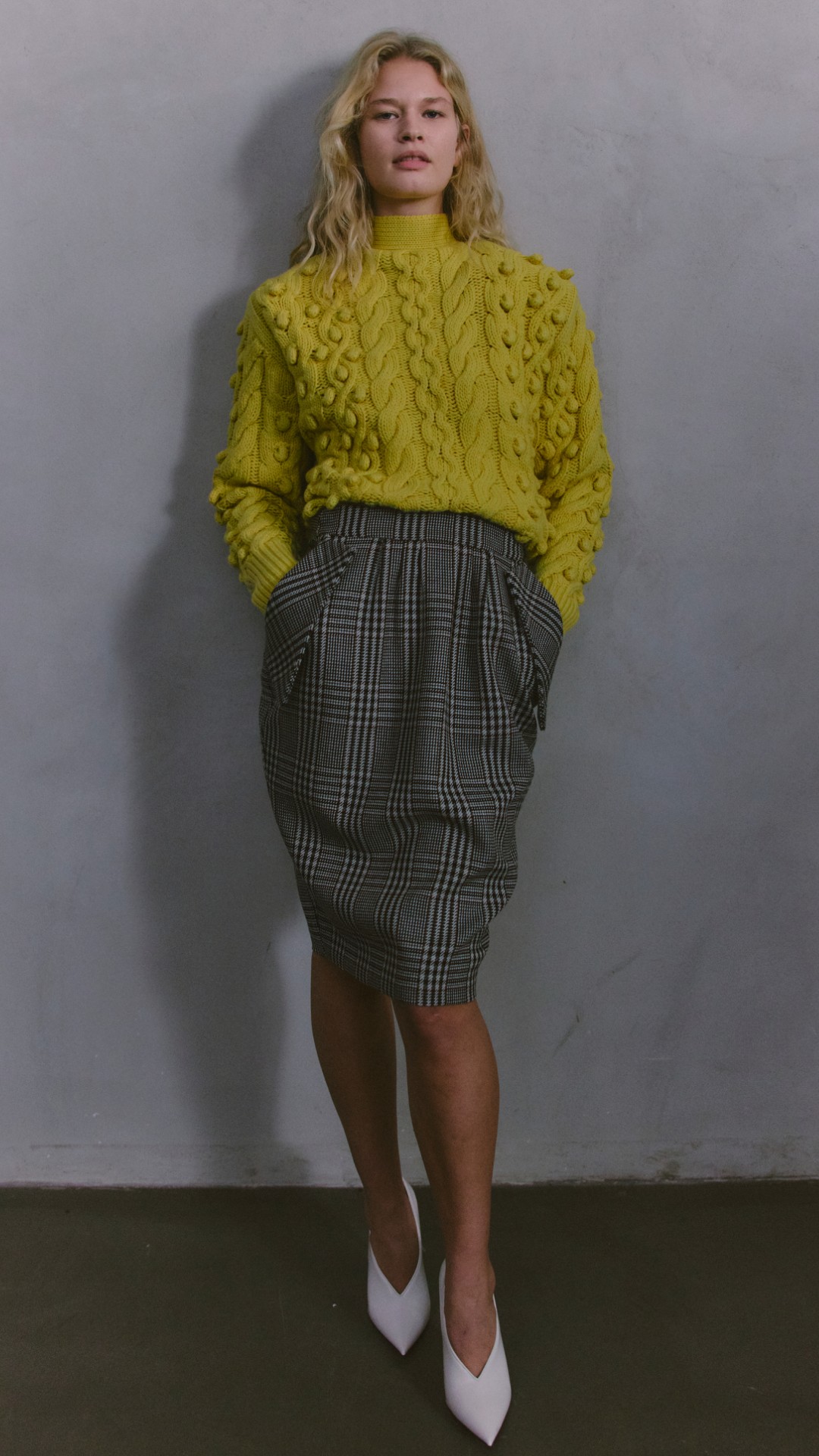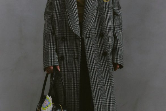 Επίσης, χρησιμοποίησε υφάσματα deadstock (περισσευούμενα) με παραδοσιακά καρό σε κοστούμια τύπου ’70s. Την ίδια ώρα, άλλα σμόκιν σακάκια, παλτό και κομμάτια ραπτικής ήταν κεντημένα στο χέρι με αφρώδεις κρυστάλλους χωρίς μόλυβδο. Ρευστά φορέματα με αέρα της δεκαετίας του 1940 είχαν ντραπέ, peplums, ώμους τύπου μαντήλι και κορδονέ δαντέλα.