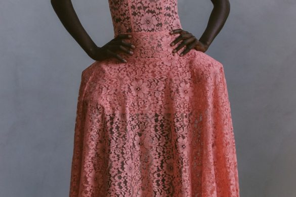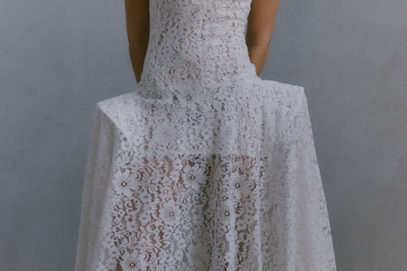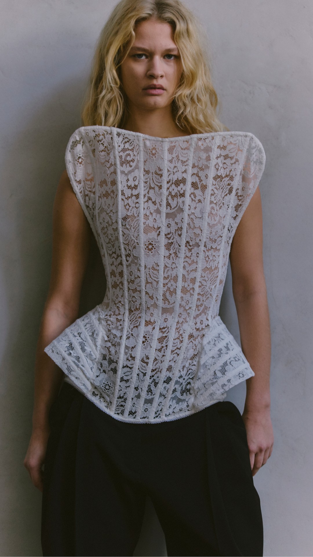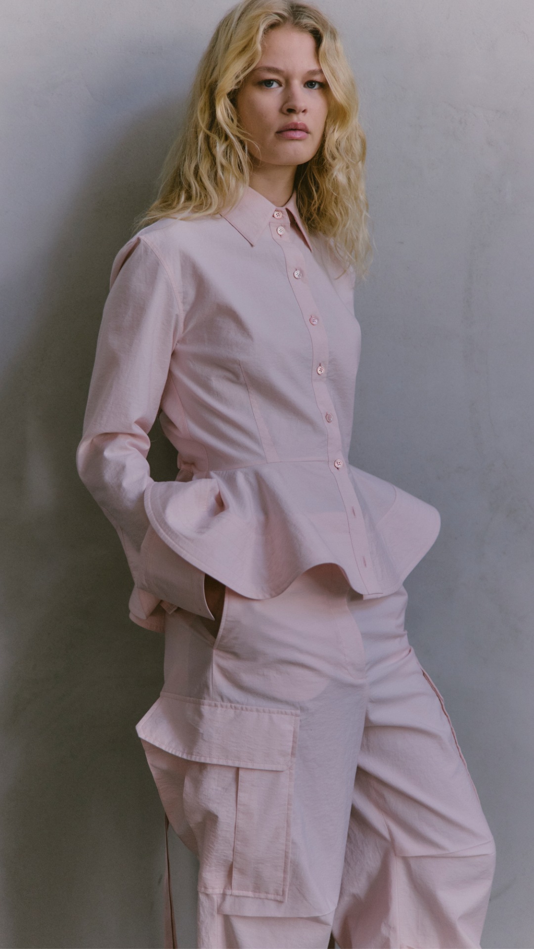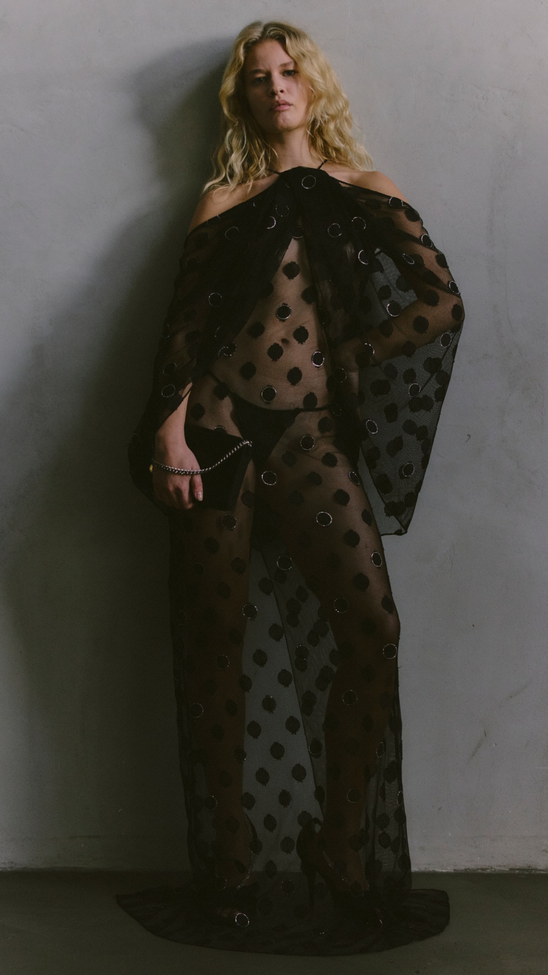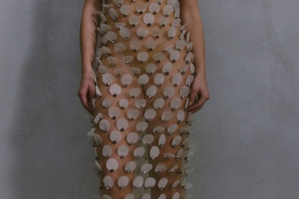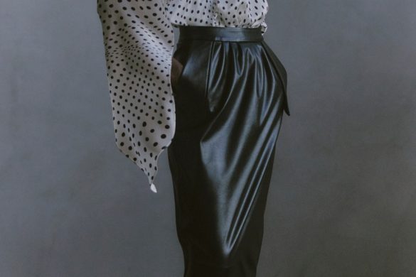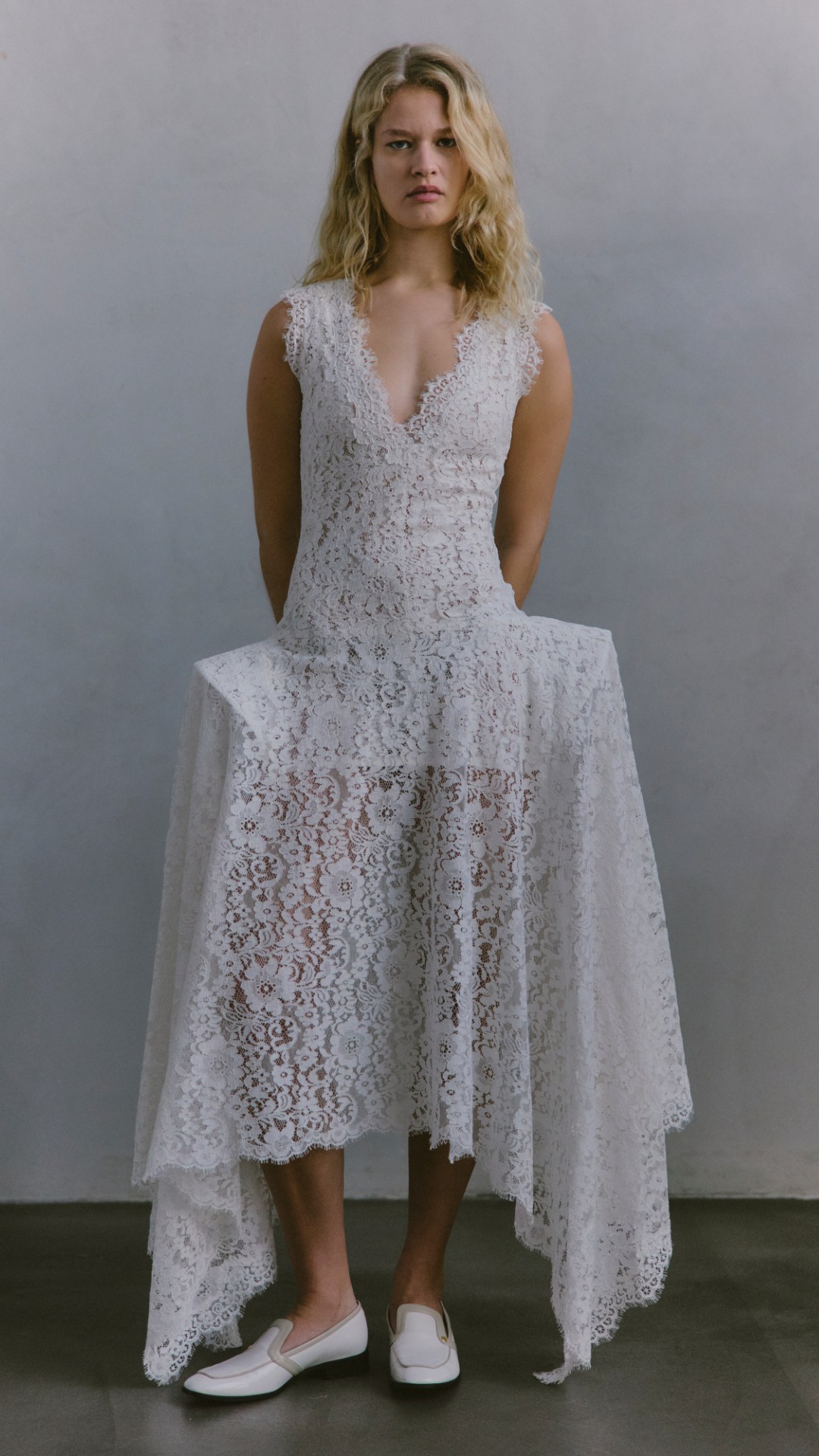 Επίσης, χρησιμοποίησε υφάσματα deadstock (περισσευούμενα) με παραδοσιακά καρό σε κοστούμια τύπου ’70s. Την ίδια ώρα, άλλα σμόκιν σακάκια, παλτό και κομμάτια ραπτικής ήταν κεντημένα στο χέρι με αφρώδεις κρυστάλλους χωρίς μόλυβδο. Ρευστά φορέματα με αέρα της δεκαετίας του 1940 είχαν ντραπέ, peplums, ώμους τύπου μαντήλι και κορδονέ δαντέλα.