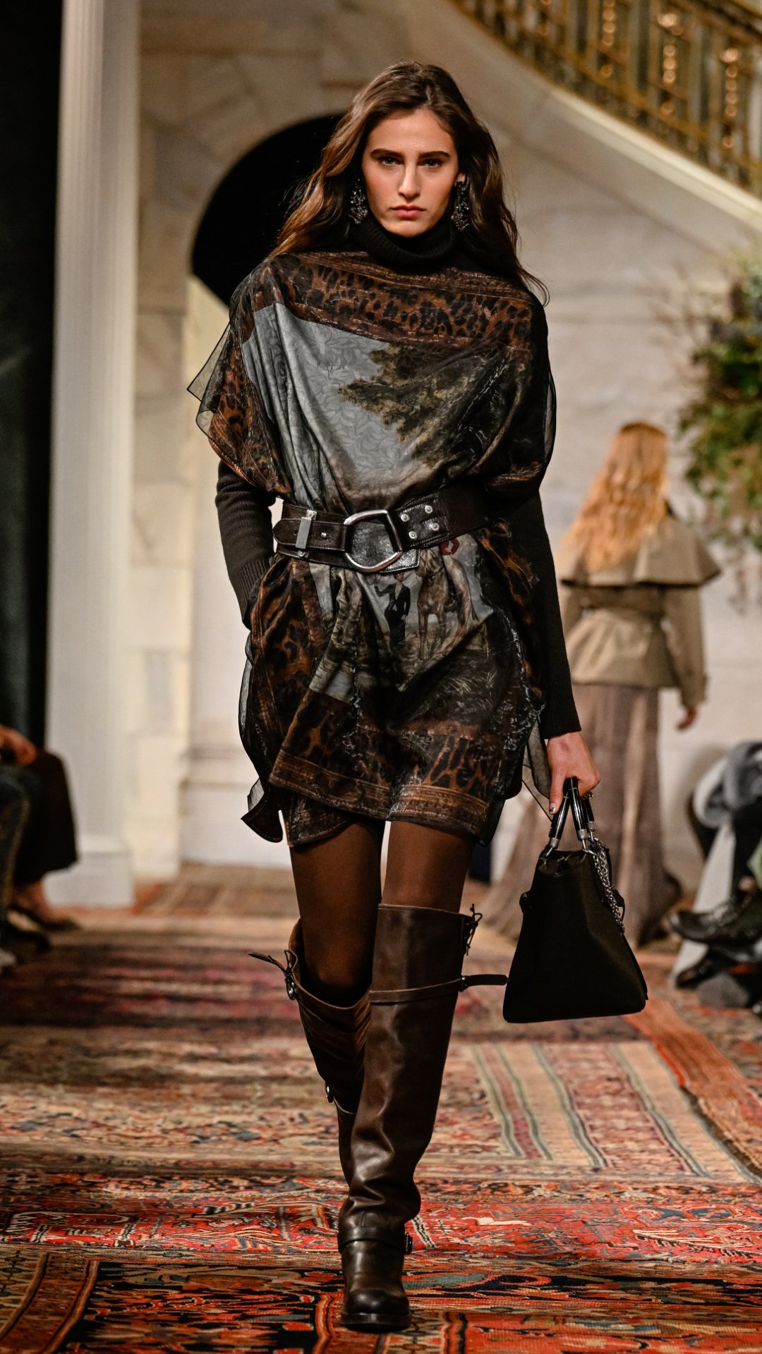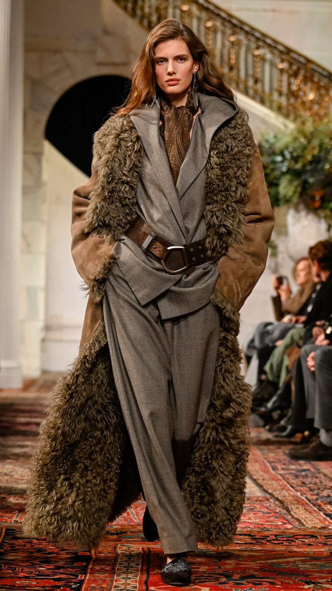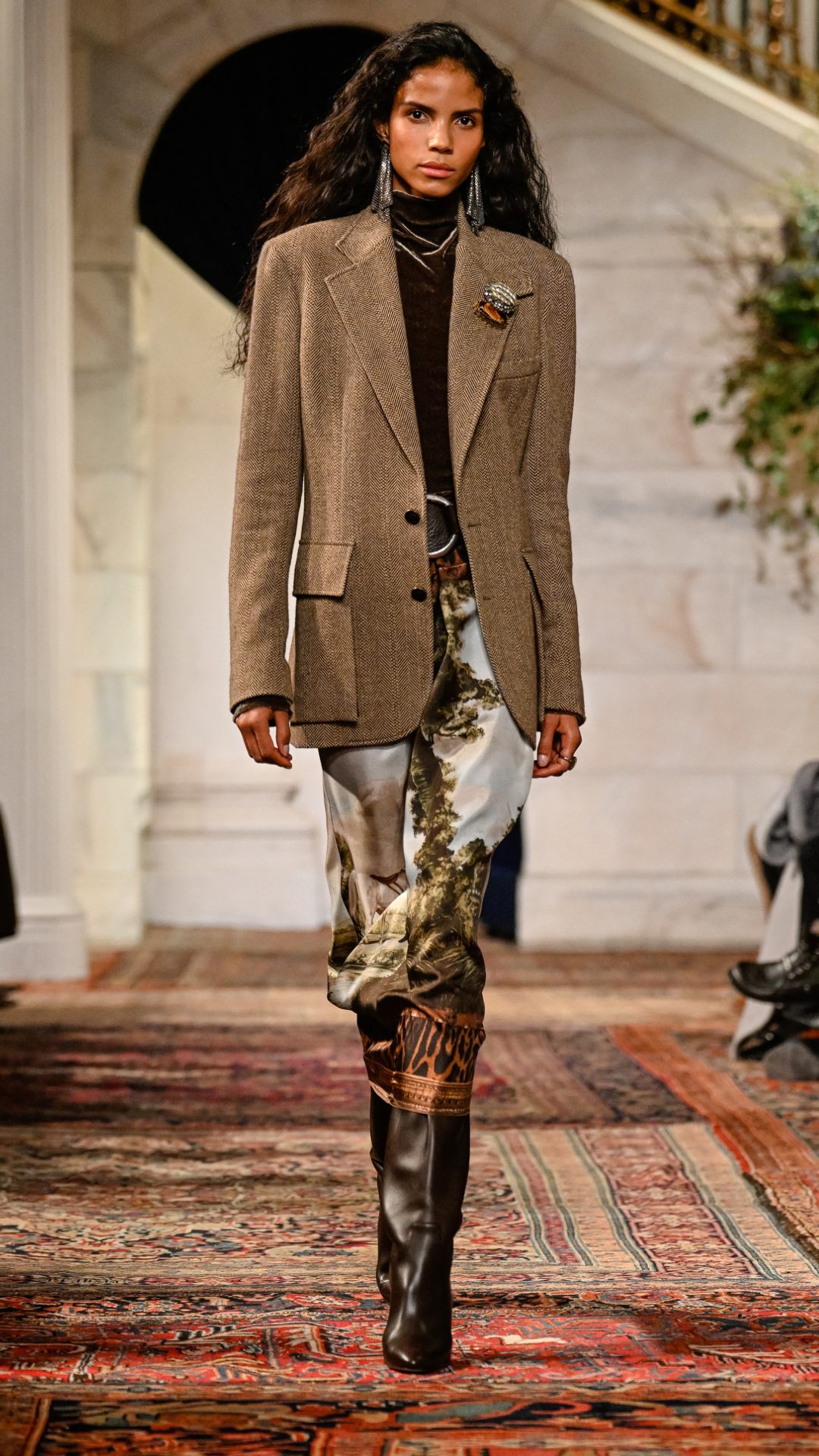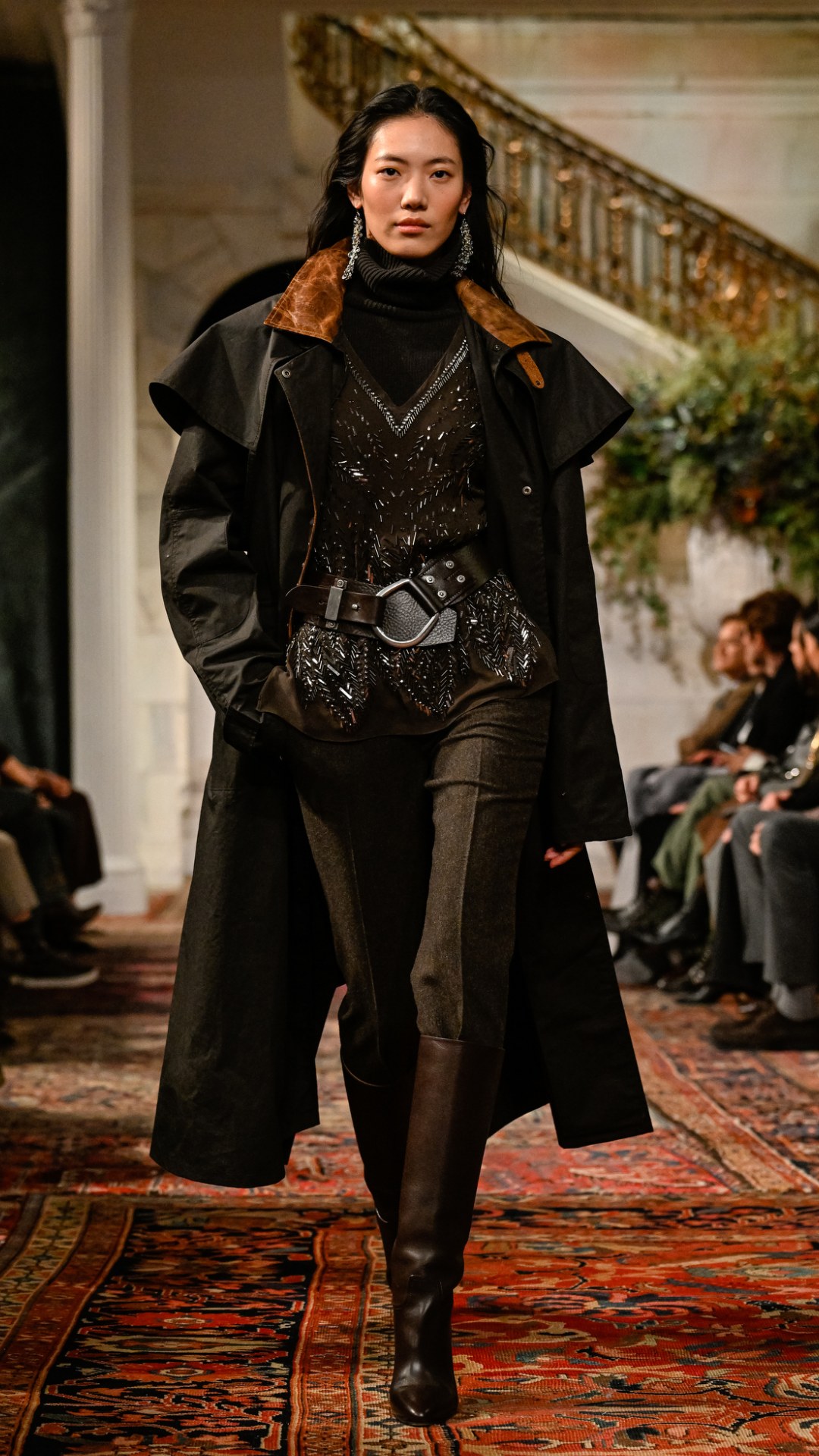 Εμπνευσμένος από το κτήμα του στο Bedford της Νέας Υόρκης, ο χώρος —τον οποίο ο Lauren είχε χρησιμοποιήσει αυτούσιο και για την παρουσίαση του φθινοπώρου 2025— διέθετε χειροποίητες τοιχογραφίες, πλούσιες βελούδινες κουρτίνες, vintage χαλιά και έπιπλα από παλαιωμένο δέρμα και animal print. Αυτό το σκηνικό πλαισίωσε ιδανικά την πλούσια, πολυεπίπεδη προσέγγιση της συλλογής.