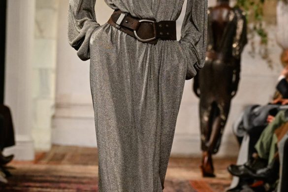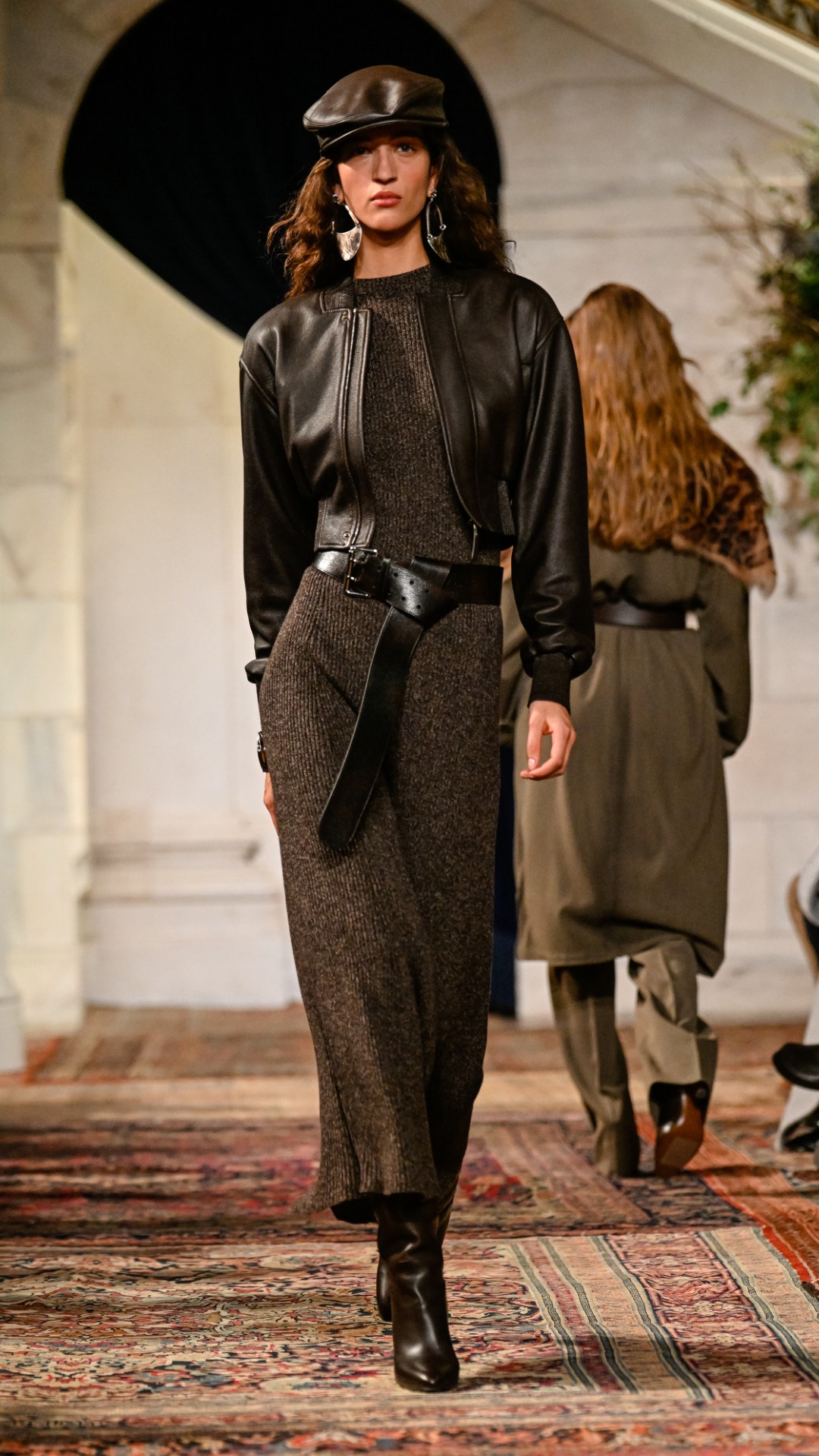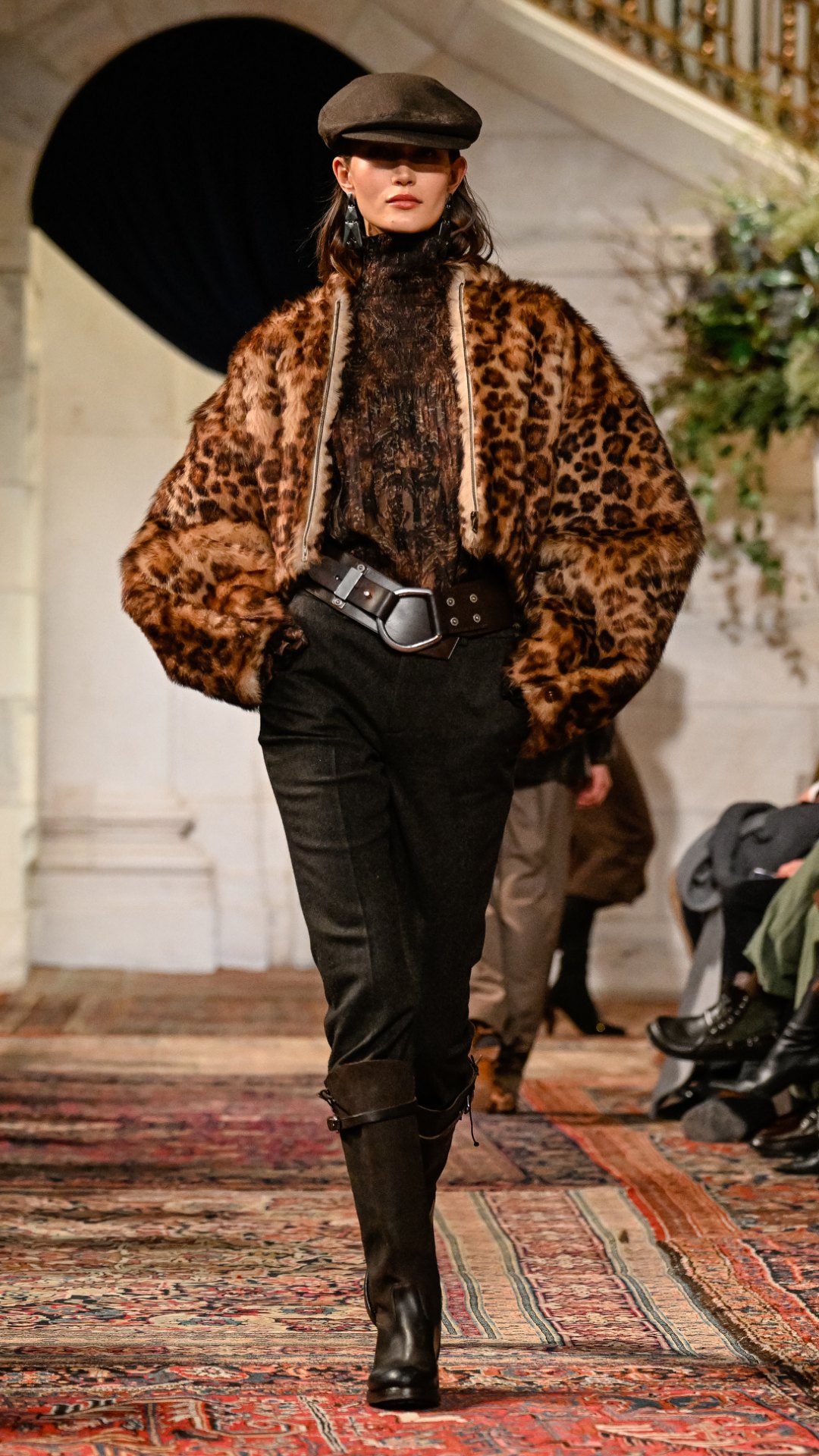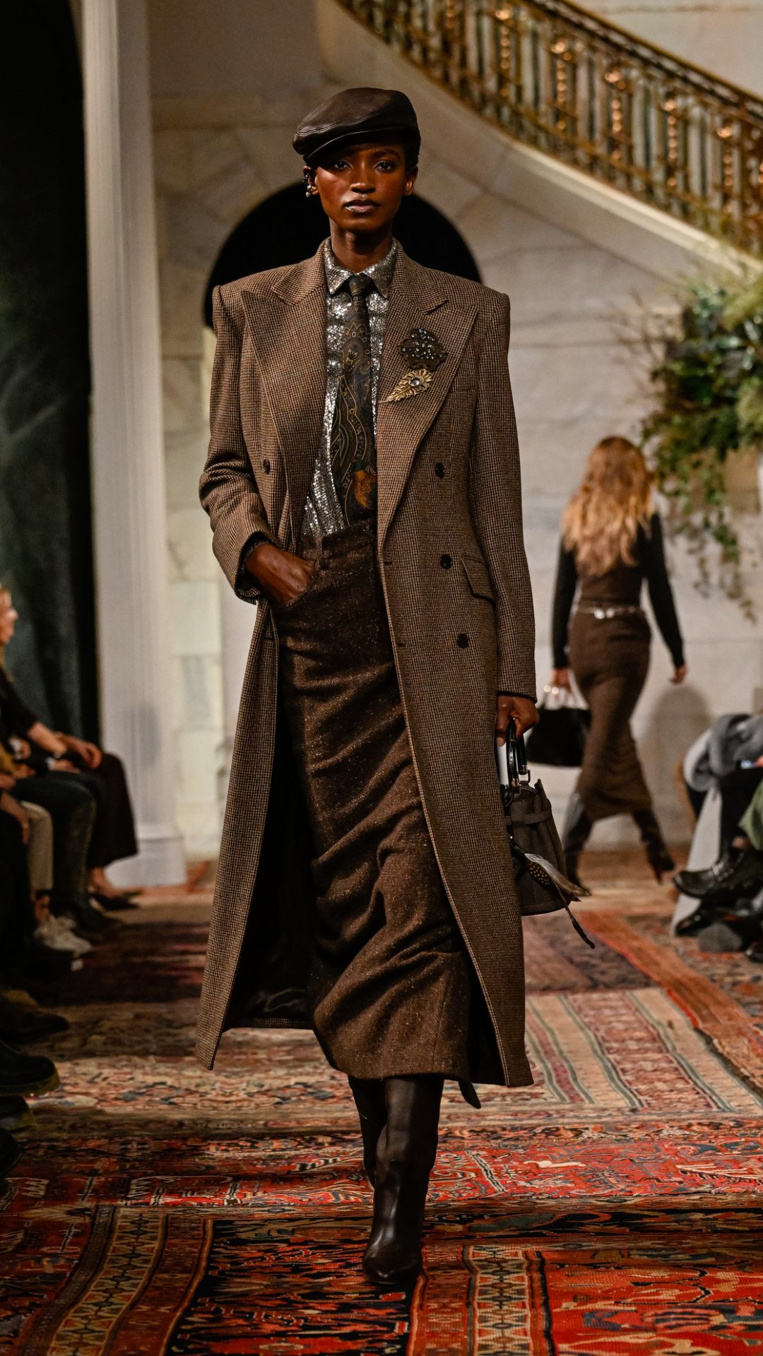 Εμπνευσμένος από το κτήμα του στο Bedford της Νέας Υόρκης, ο χώρος —τον οποίο ο Lauren είχε χρησιμοποιήσει αυτούσιο και για την παρουσίαση του φθινοπώρου 2025— διέθετε χειροποίητες τοιχογραφίες, πλούσιες βελούδινες κουρτίνες, vintage χαλιά και έπιπλα από παλαιωμένο δέρμα και animal print. Αυτό το σκηνικό πλαισίωσε ιδανικά την πλούσια, πολυεπίπεδη προσέγγιση της συλλογής.