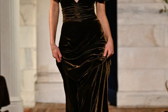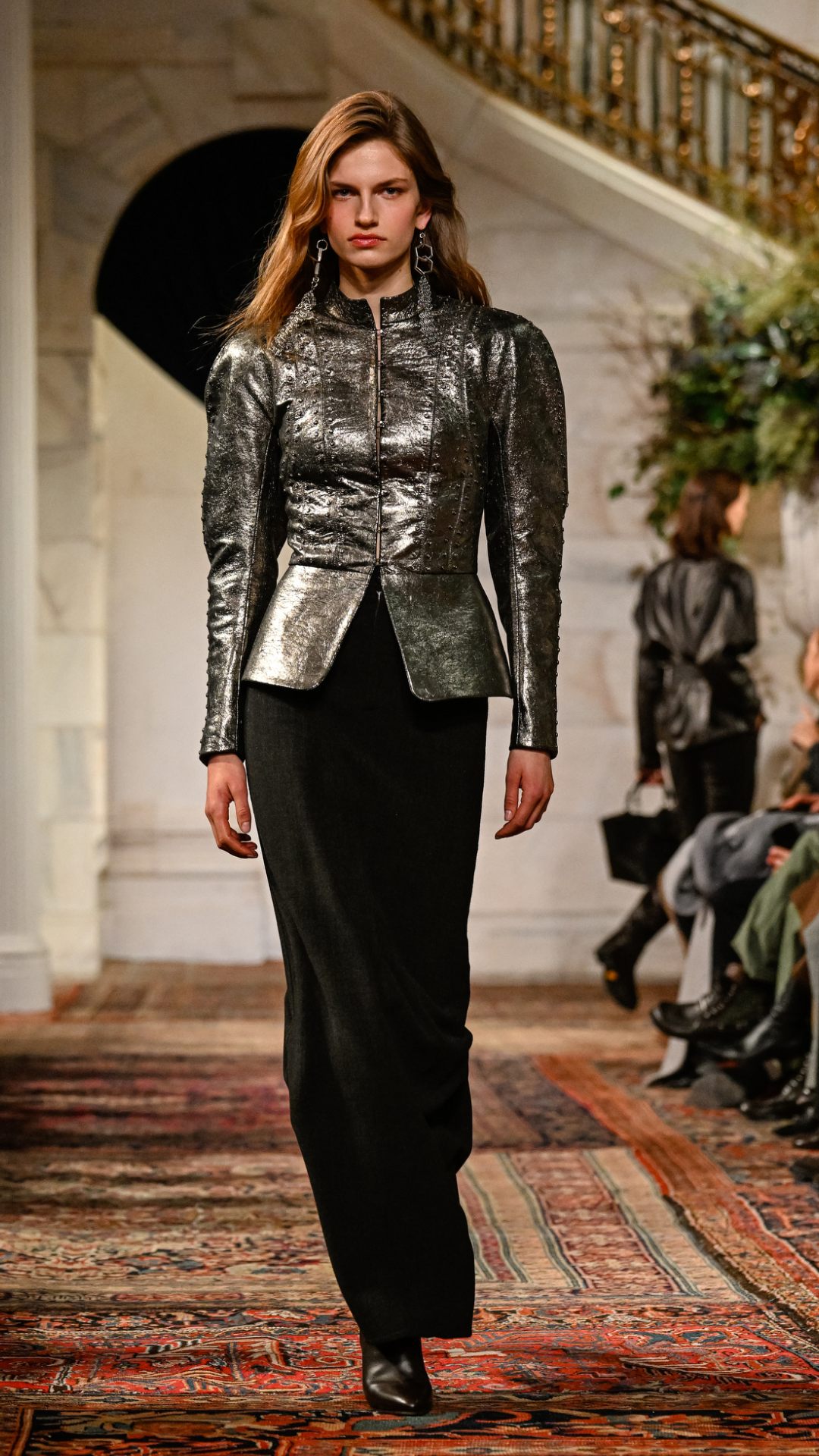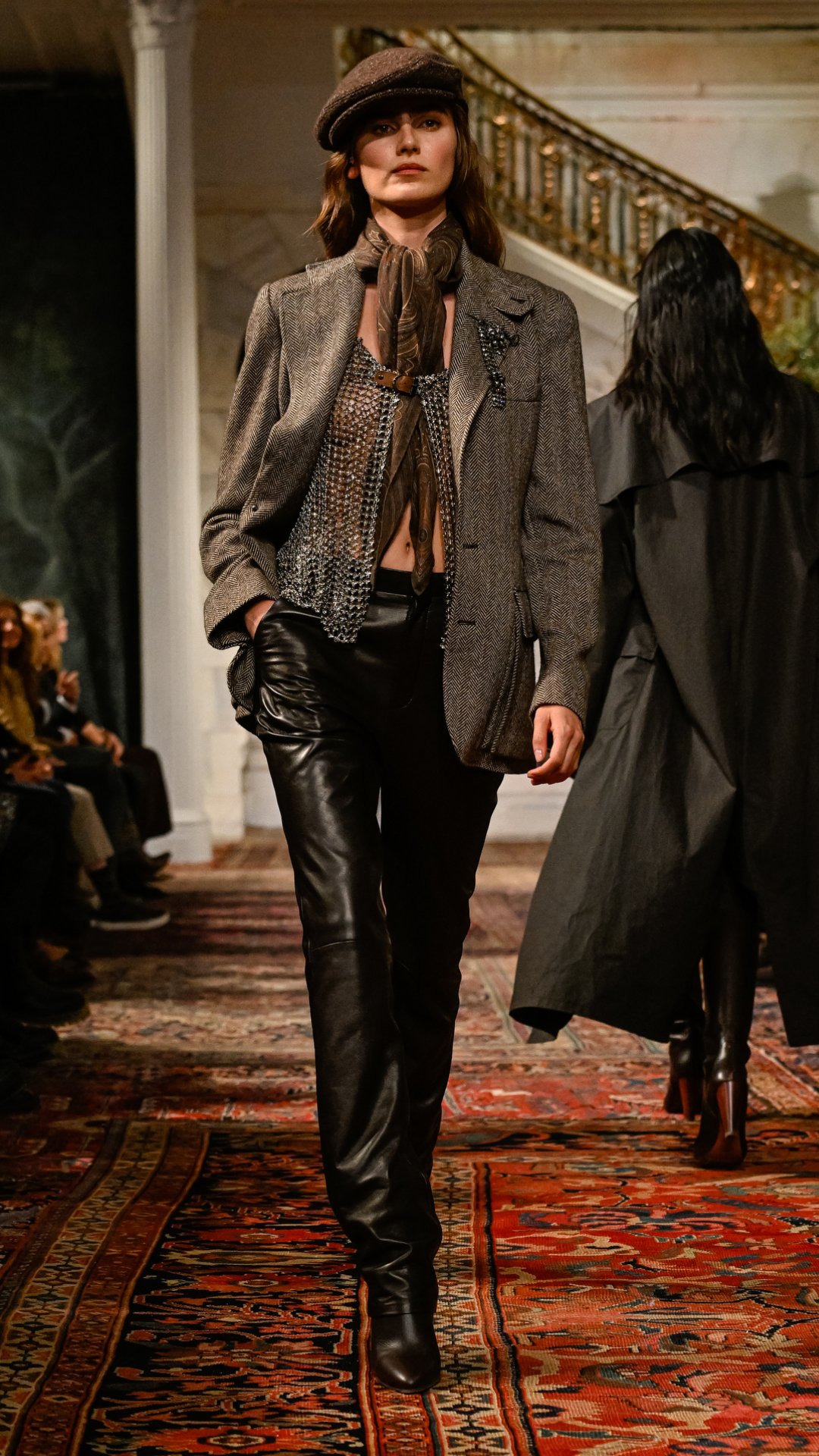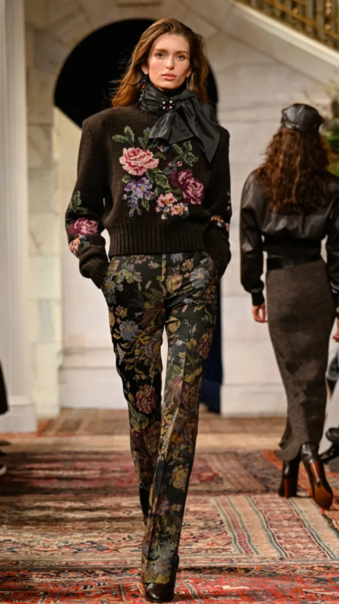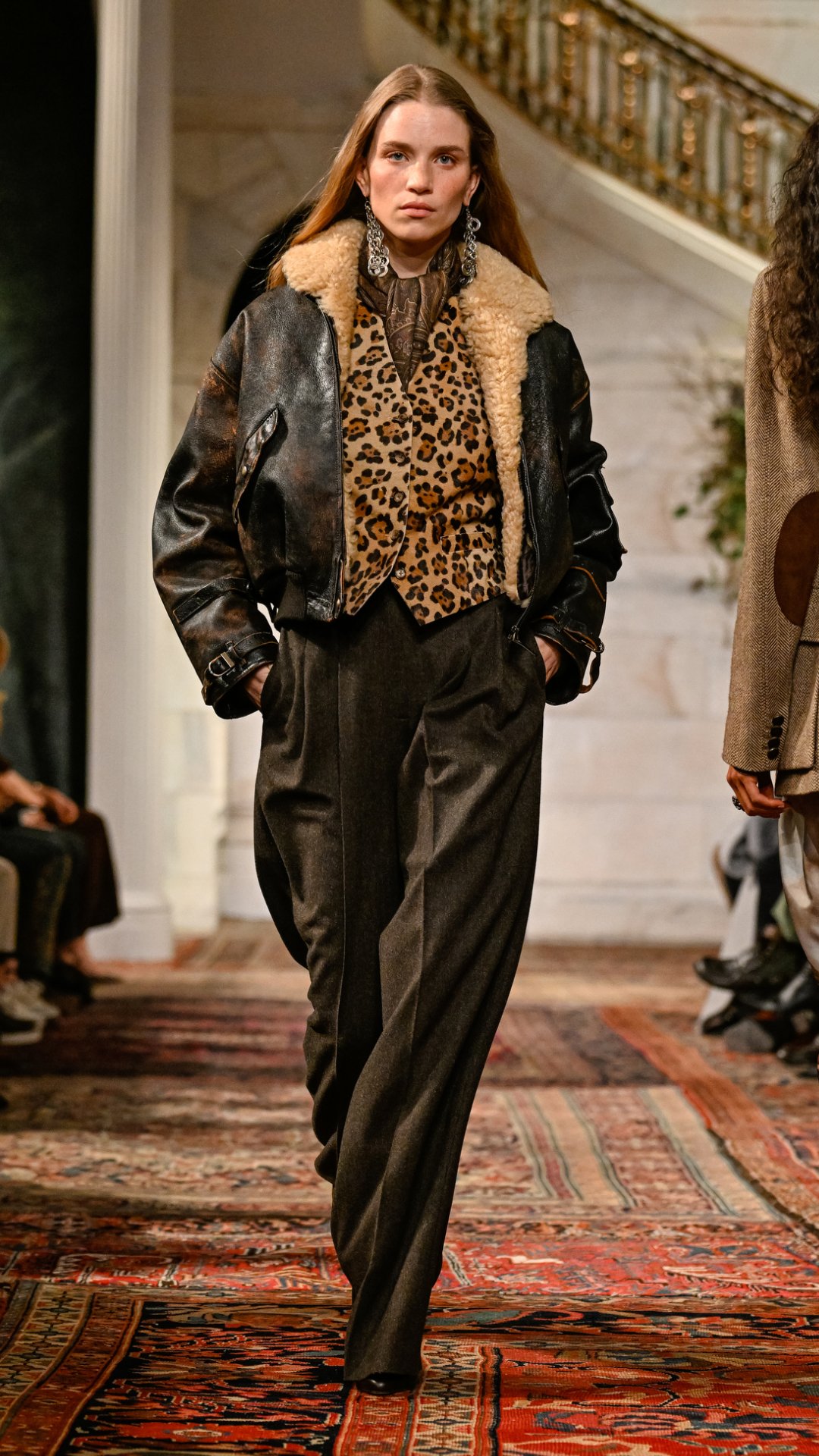 Εμπνευσμένος από το κτήμα του στο Bedford της Νέας Υόρκης, ο χώρος —τον οποίο ο Lauren είχε χρησιμοποιήσει αυτούσιο και για την παρουσίαση του φθινοπώρου 2025— διέθετε χειροποίητες τοιχογραφίες, πλούσιες βελούδινες κουρτίνες, vintage χαλιά και έπιπλα από παλαιωμένο δέρμα και animal print. Αυτό το σκηνικό πλαισίωσε ιδανικά την πλούσια, πολυεπίπεδη προσέγγιση της συλλογής.