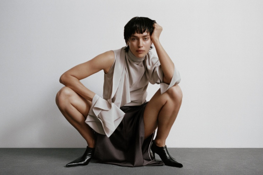 Για την εμφάνιση της Irina Shayk, ο creative director επέλεξε ένα minimal και λαμπερό μακιγιάζ,.με το hairstyling του Akki Shirakawa στο pixie haircut του μοντέλου να κλέβει την παράσταση.