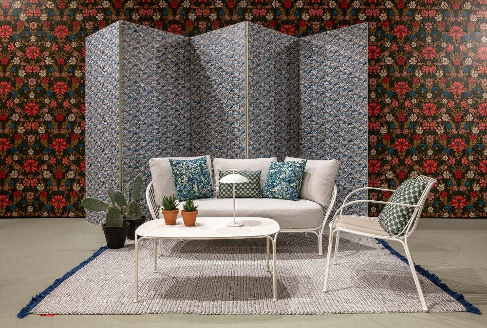 Τα δύο σχέδια επίπλων παρουσιάζονται μαζί με μια σειρά από τολμηρά φλοράλ και γεωμετρικά υφάσματα για τον. εμβληματικό καναπέ “Pop” της Kartell, την πολυθρόνα “Trix Pouf” του Piero Lissoni και την πολυθρόνα “Cara” των Philippe Starck και Sergio Schito. Επαναλαμβάνοντας τα αρχειακά υφάσματα Liberty σε νέες αποκλειστικές αποχρώσεις,. η capsule συλλογή περιλαμβάνει 10 σχέδια σε υφάσματα εσωτερικού και εξωτερικού χώρου.