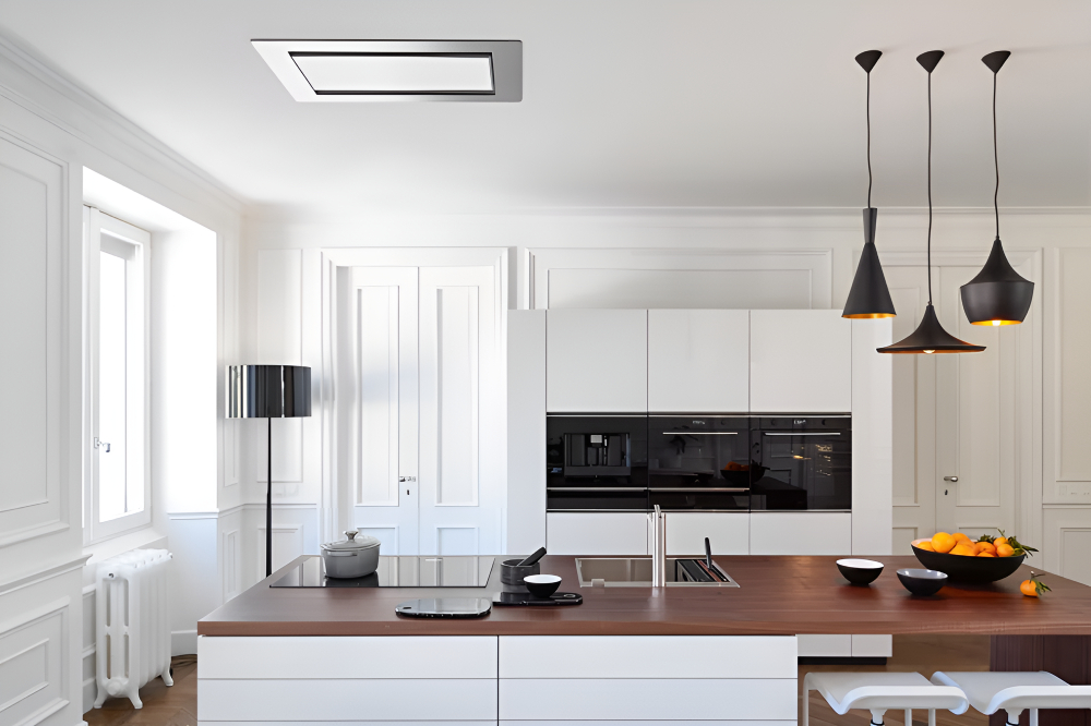 Ο απορροφητήρας νησίδας T-Shelf ξεχωρίζει για το ματ μαύρο φινίρισμα, την ενεργειακή κλάση Α και τις κομψές λεπτομέρειες από φιμέ γυαλί. Πρόκειται για ένα χαρακτηριστικό παράδειγμα ισορροπίας ανάμεσα στην εργονομία και την υψηλή αισθητική.