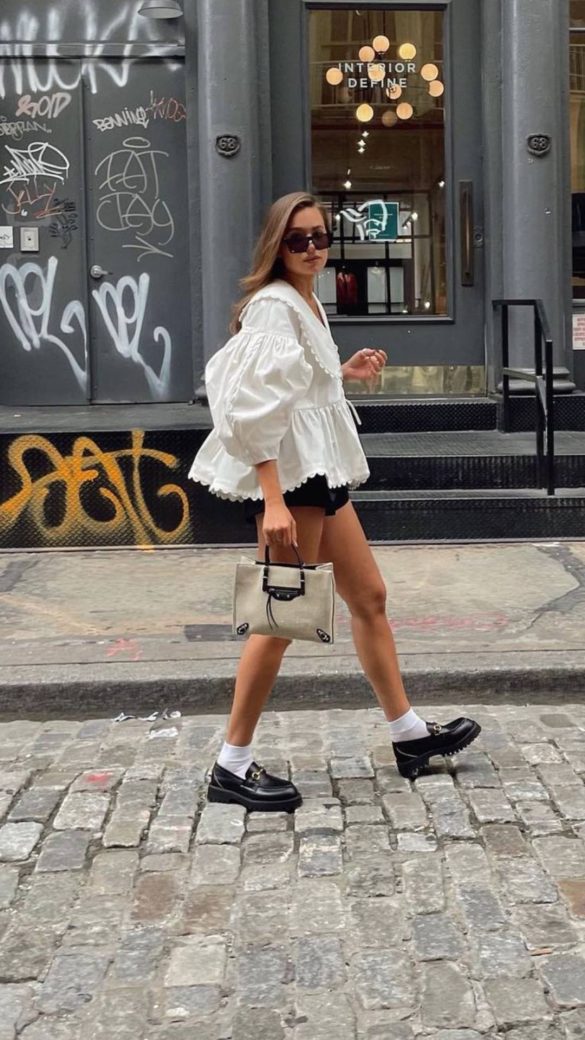 Αν θέλεις να πας ένα βήμα παραπέρα, δοκίμασε τα με ψηλές κάλτσες. Είτε λευκές είτε σε έντονα χρώματα, προσθέτουν χαρακτήρα και κάνουν το outfit πιο ενδιαφέρον.