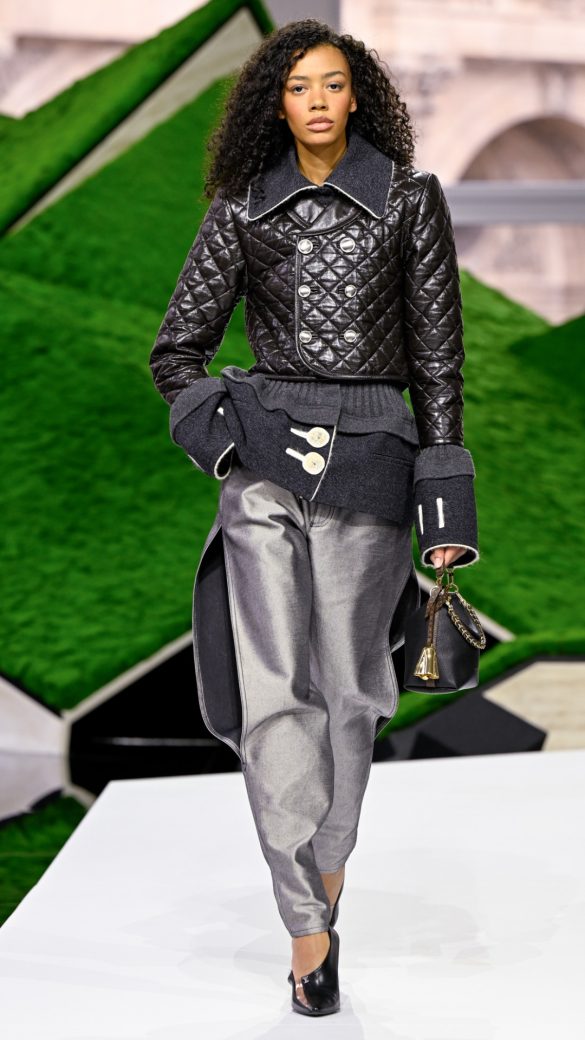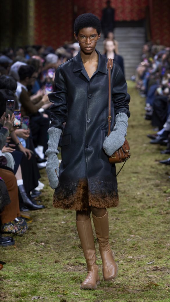 Στενά παλτό με ψηλές ζώνες, φθαρμένα σε ορισμένα σημεία ώστε να γυαλίζουν, συνοδεύονταν από ασορτί παντελόνια καμπάνα που σέρνονταν στο χώμα. Υπήρχε μια DIY αίσθηση στα πληθωρικά δερμάτινα παλτό με τα ακατέργαστα τελειώματα και στα λεπτά cropped αντιανεμικά με επένδυση προβάτου (shearling).
