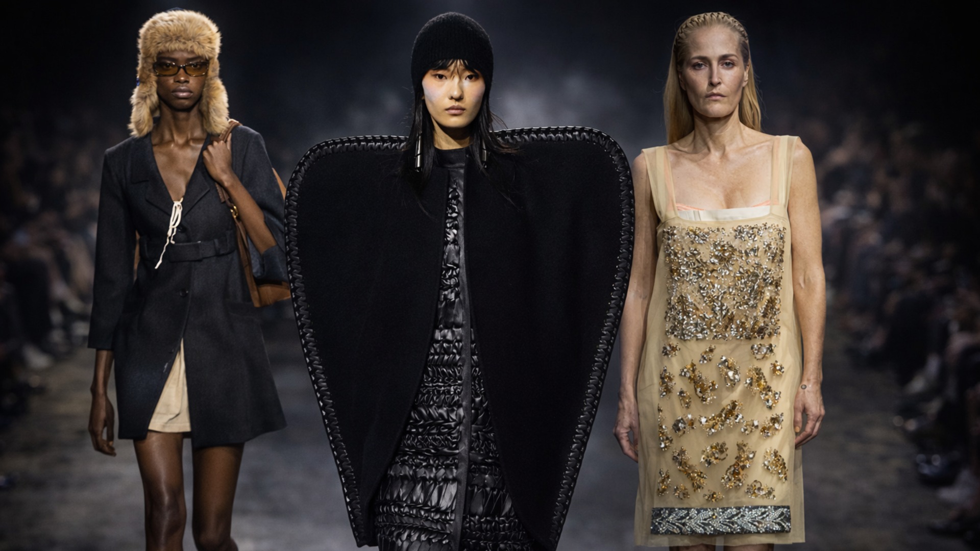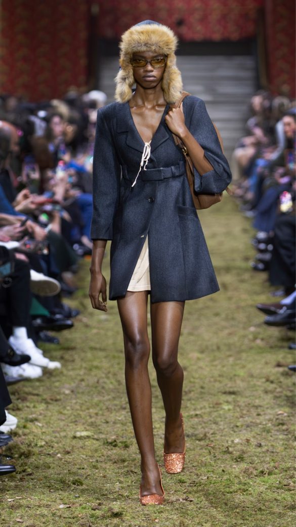 Η Prada, ωστόσο, φάνηκε να υπονοεί ότι καμία ποσότητα τεχνικών υφασμάτων (όπως το Airalite ή το Heattech) δεν θα μπορούσε να σε κρατήσει ασφαλή. Τα μικροσκοπικά tank dresses, τα «συρρικνωμένα» τζάκετ από επεξεργασμένο δέρμα και τα τσαλακωμένα βαμβακερά μπλέιζερ είχαν μια αίσθηση «φορεμένου», σαν να ήταν τα τελευταία κομμάτια που απέμειναν σε μια γκαρνταρόμπα.